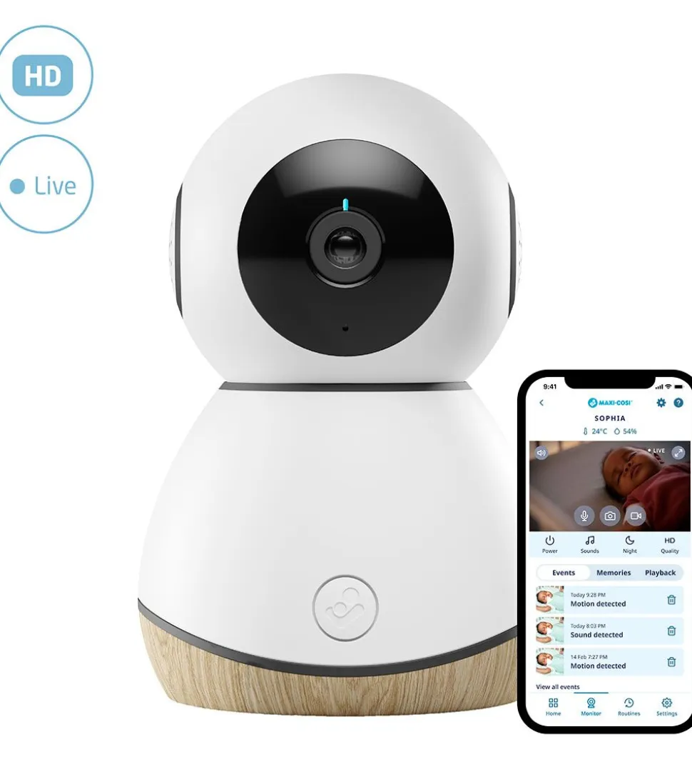 Maxi-Cosi babyalarmen har enkelt og minimalistisk design, som passer godt og diskret ind i de fleste hjem. Den registrerer lyd og bevægelse, og når alarmen er forbundet til et trådløst internet, sender den video i HD-kvalitet til en app (Connected Home). Babymonitoren kan styres fra appen, hvorfra den kan panorere og vippe, og der kan kan zoomes ind på barnet, som man vil holde øje med. Babyalarmen kan afspille hvid lyd (2 forskellige) eller beroligende musik (5 forskellige vuggeviser), når du ønsker det, eller den kan indstilles til at afspille lyde, når den registrerer at barnet er ved at vågne. Her kan man indstille, hvor følsom den skal være. Lydniveauet kan også justeres.