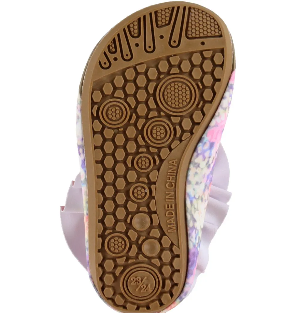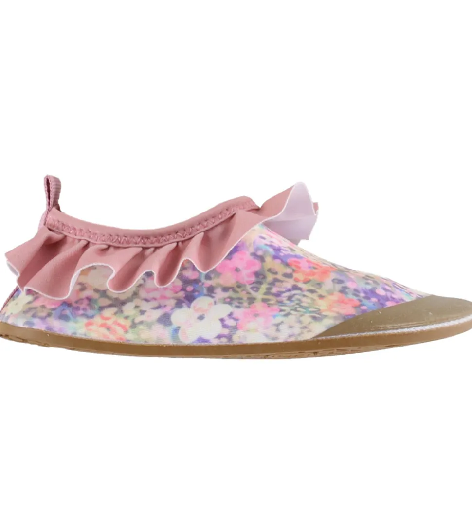 Fine Mikk-Line badesko i blomstret design med en rosa flæsekant omkring åbningen og brune detaljer.