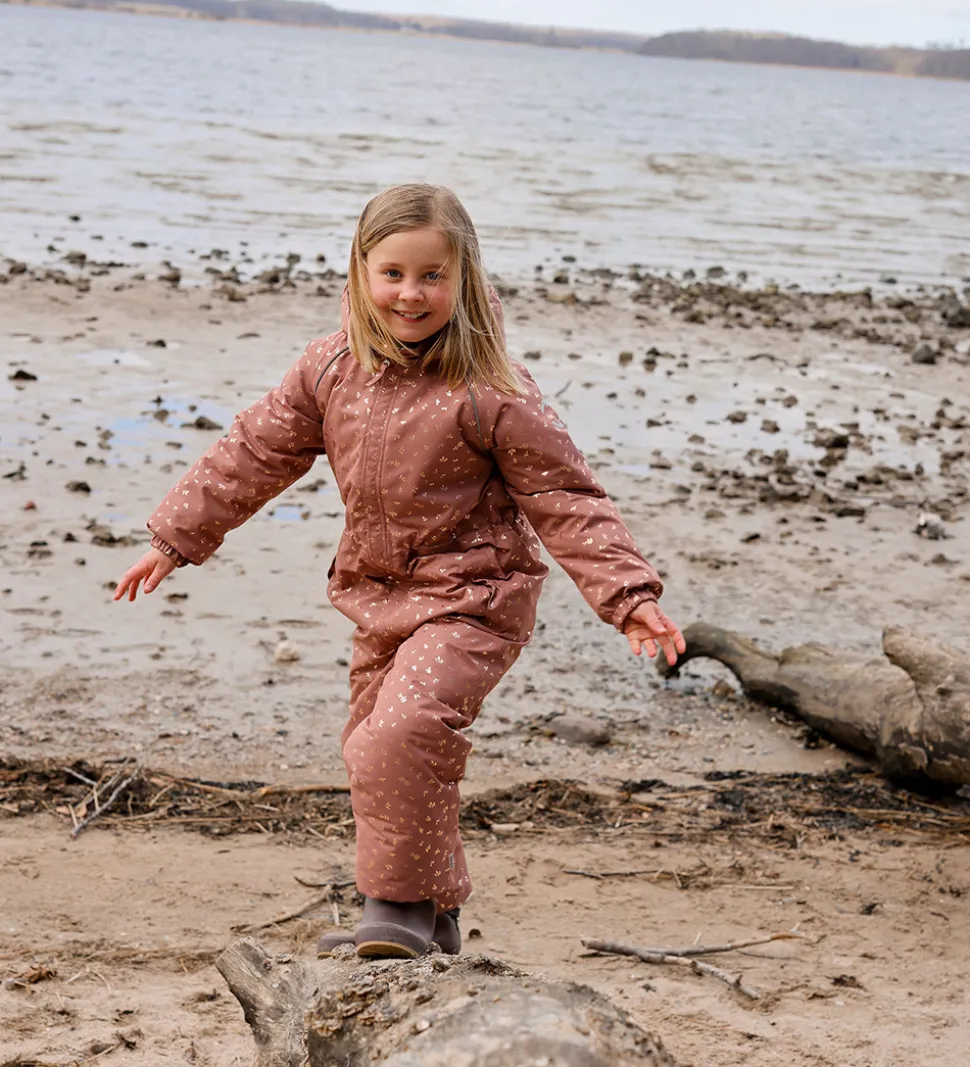 Fin Mikk-Line flyverdragt i rosa med metallisk print af blade i guldb . Flyverdragten har refleksdetaljer langs skuldrene, på venstre ærmer og på hætten.