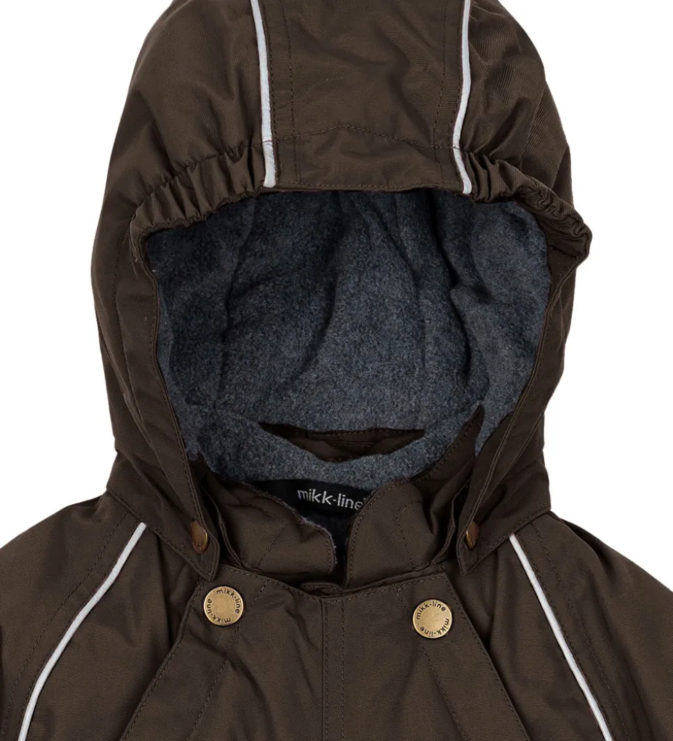 Mikk-Line flyverdragten har en smal krave og en aftagelig hætte, som kan knappes af med trykknapper. I siderne på hætten er der elastikkanter, som giver hætten en god pasform.