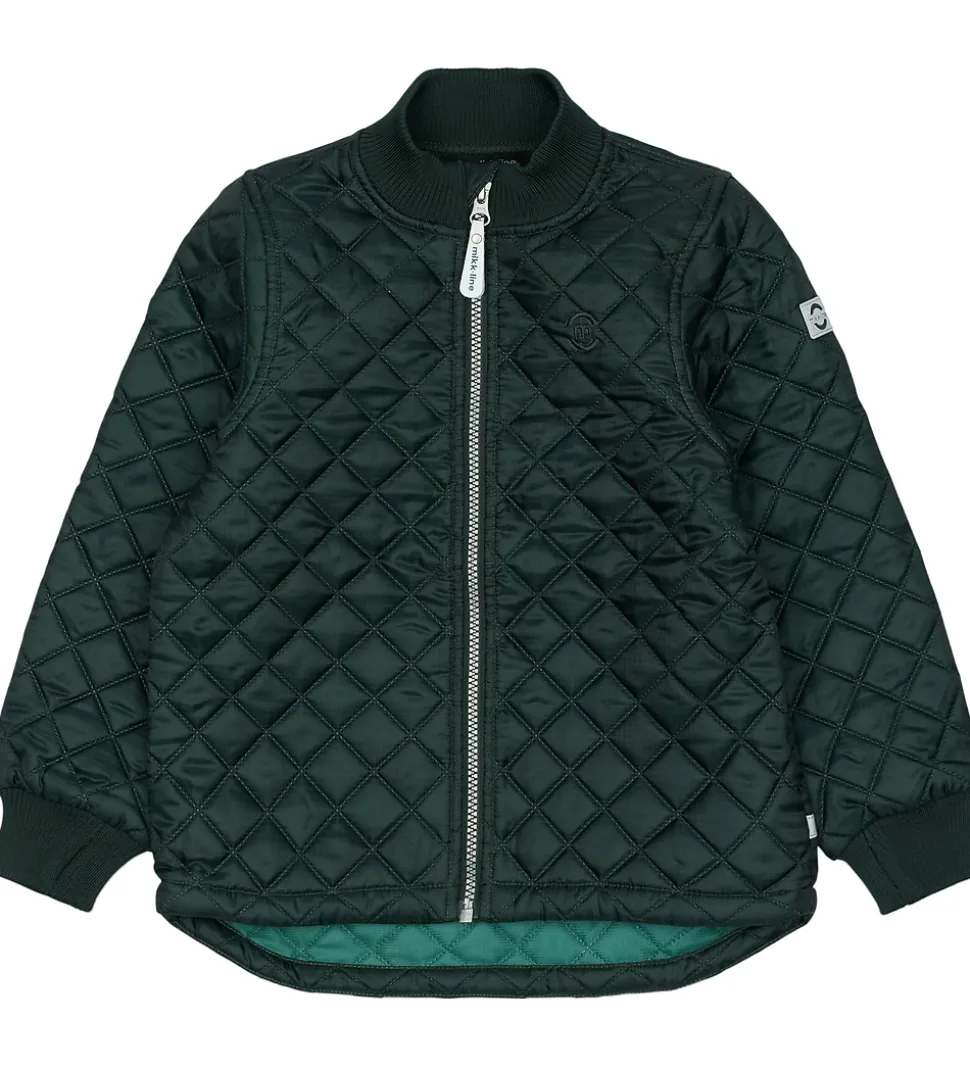 Fint Mikk-Line termotøj bestående af en termojakke og et par termobukser i mørkegrøn med en quiltet struktur.