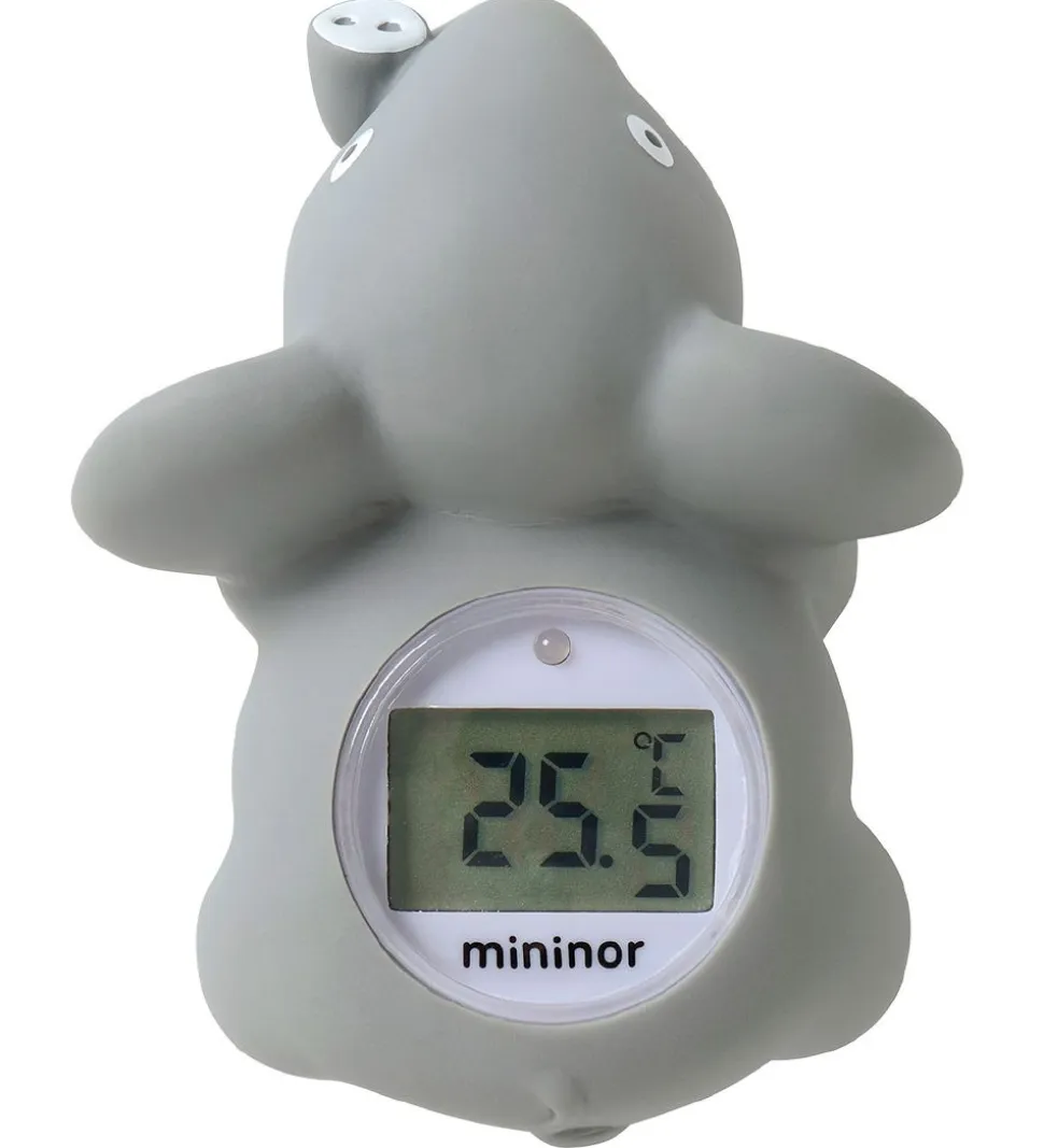 Mininor badetermometeret er digitalt, og på ryggen aflæses temperaturen. Termometeret er nyttigt, når der skal måles temperatur i badevandet, så vandet får den helt rigtige temperatur til den lille.