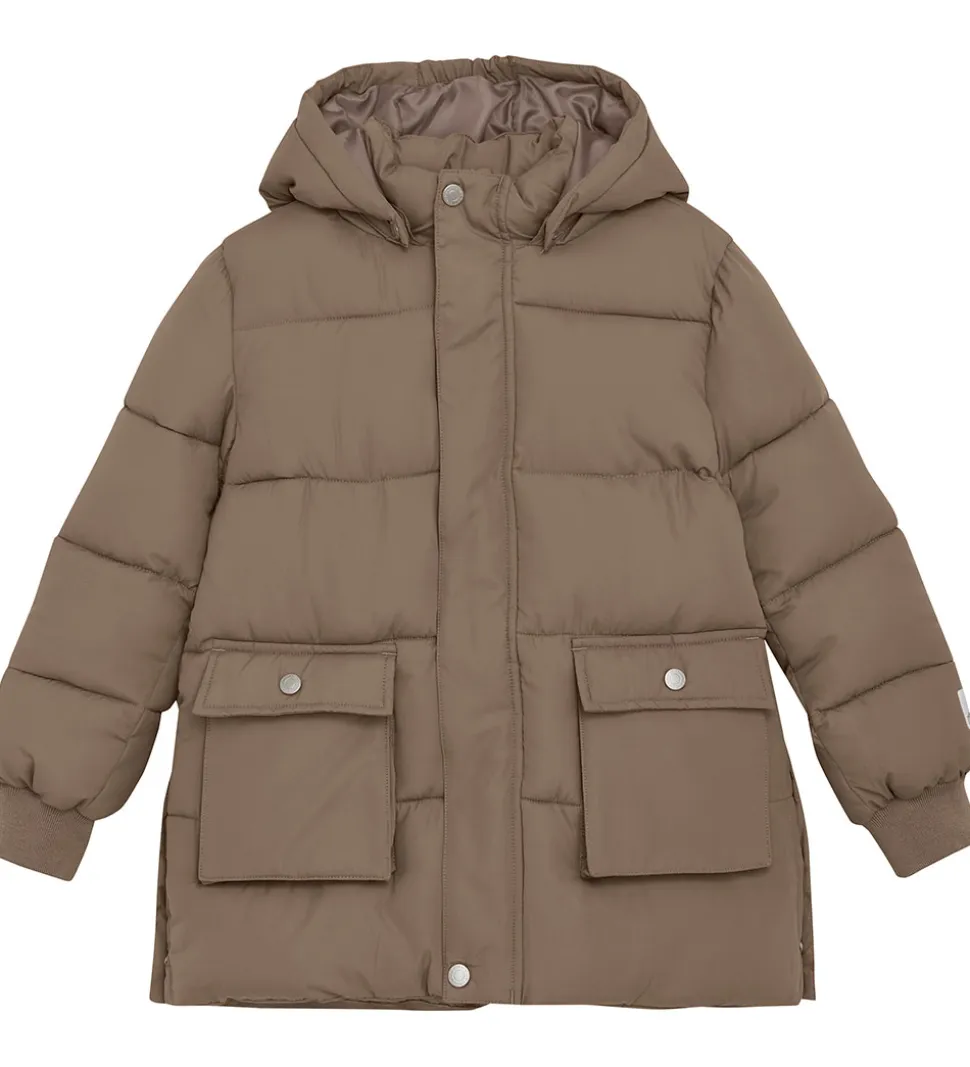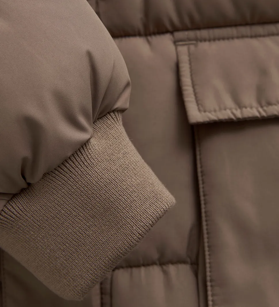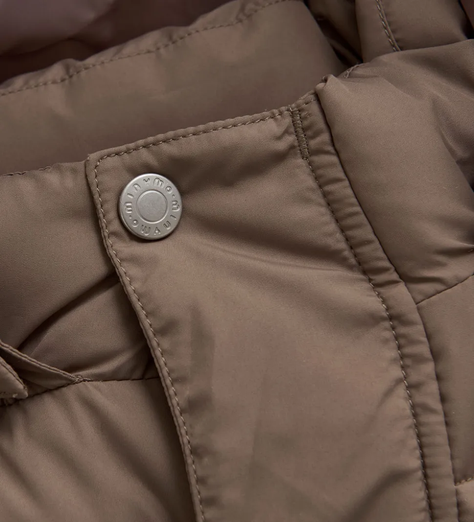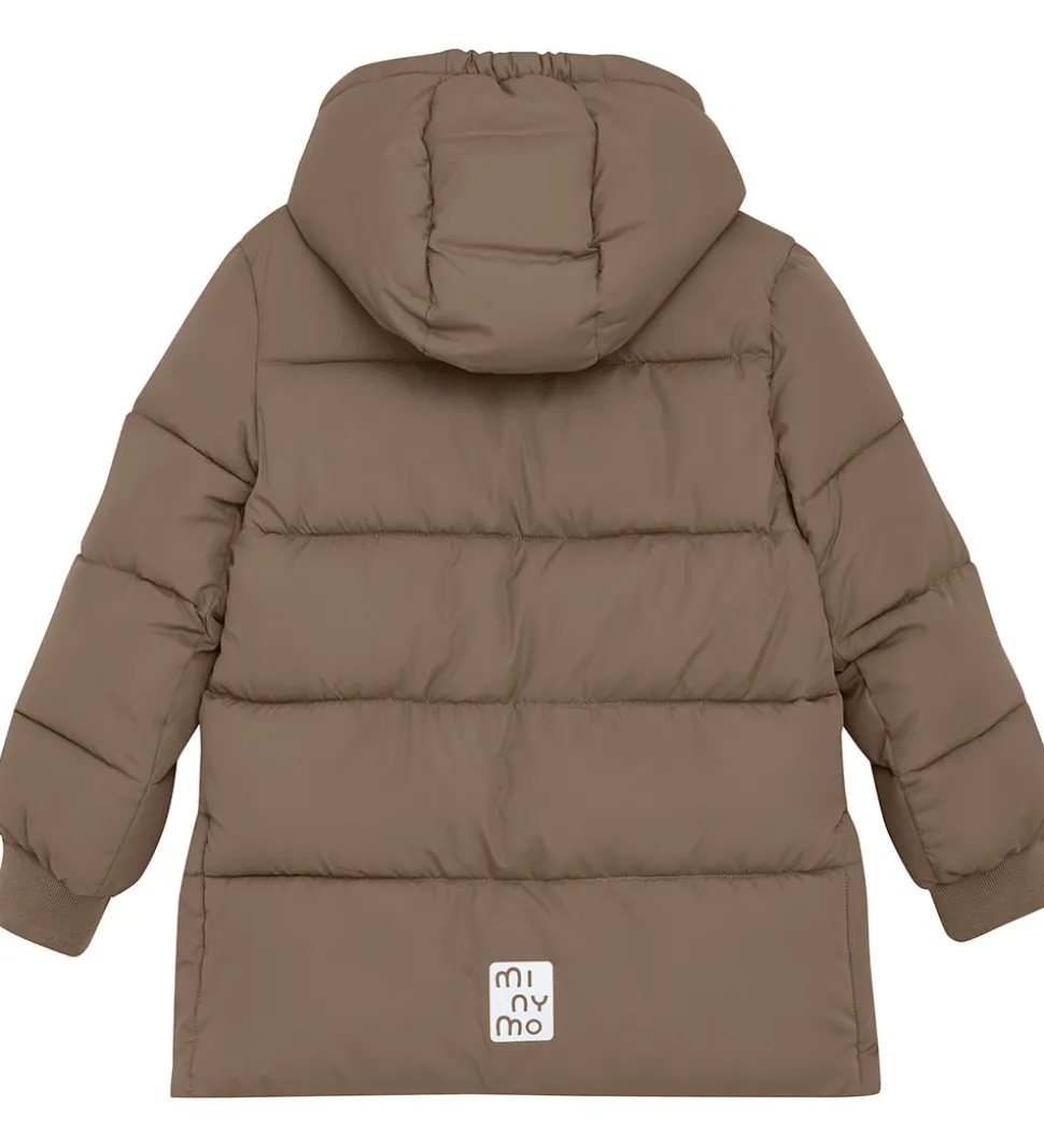 Stilfuld Minymo dynejakke i lysebrun med vandrette syninger.