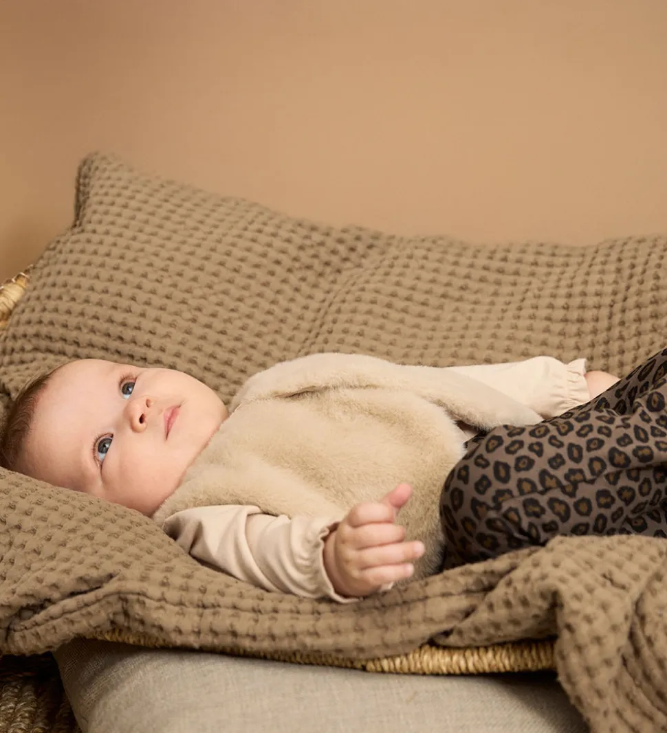 Minymo vesten har en enkel knaplukning foran, der giver et stilrent look. På indersiden er der blødt bomuldsjersey. Perfekt til at tilføje et hyggeligt lag til ethvert outfit.