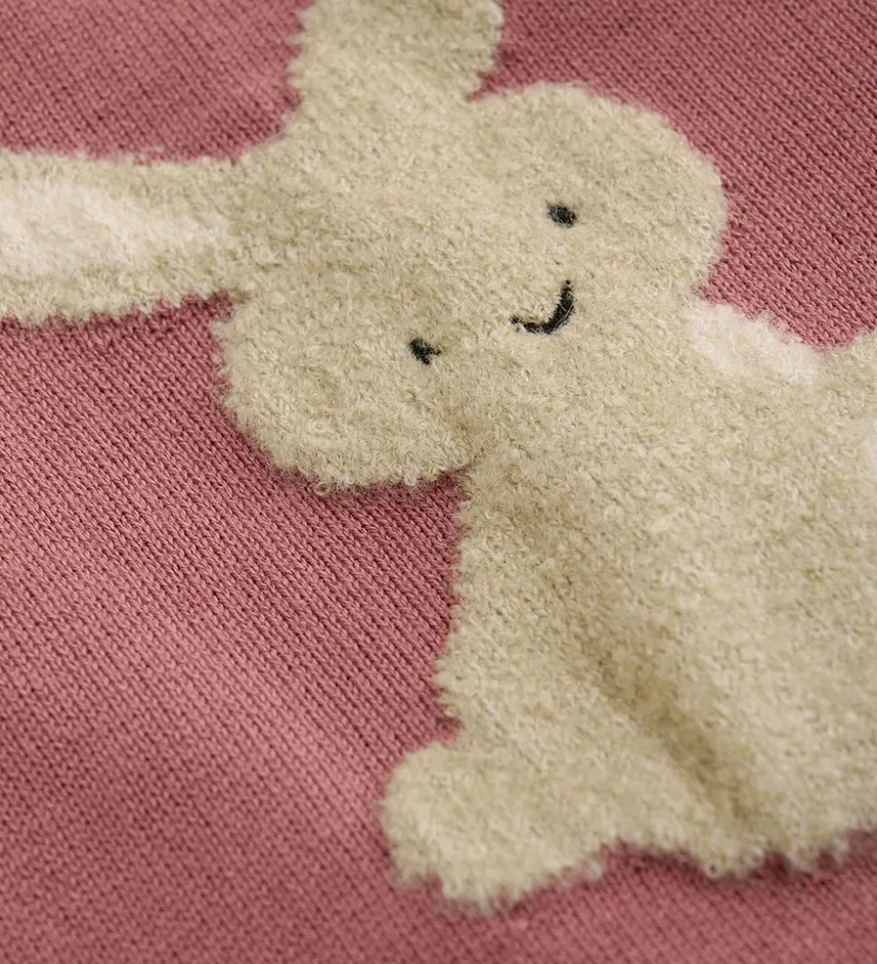 Flot Minymo vest i en dyb rosa farve. På fronten ses et stort, fint kaninmotiv. Vesten fra Minymo har knaplukning ved skulderen for nem påklædning.