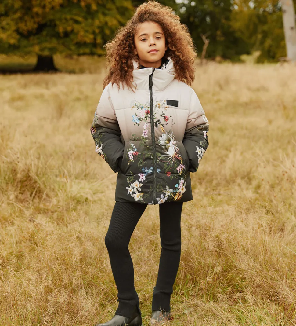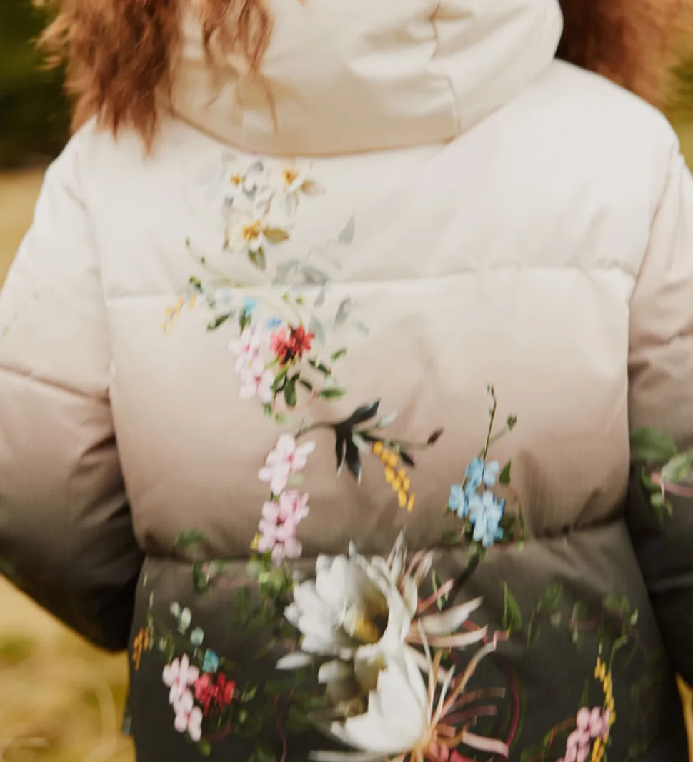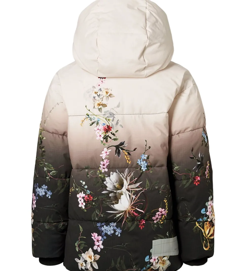 Smart Molo dynejakke i en elegant gradueret beige til mørk brun nuance med smukt blomsterprint. Dynejakken har vandrette syninger og en diskret indvævet struktur i stoffet samt et logo på venstre bryst. Nederst på ryggen er der en logorefleks.