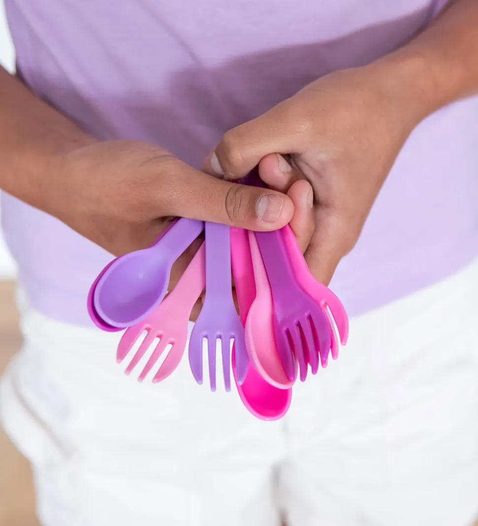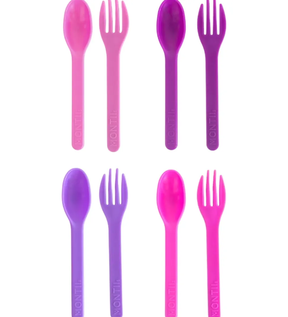 Fint MontiiCo børnebestik i rosa og lilla nuancer bestående af 8 dele med 4 skeer og 4 gafler.