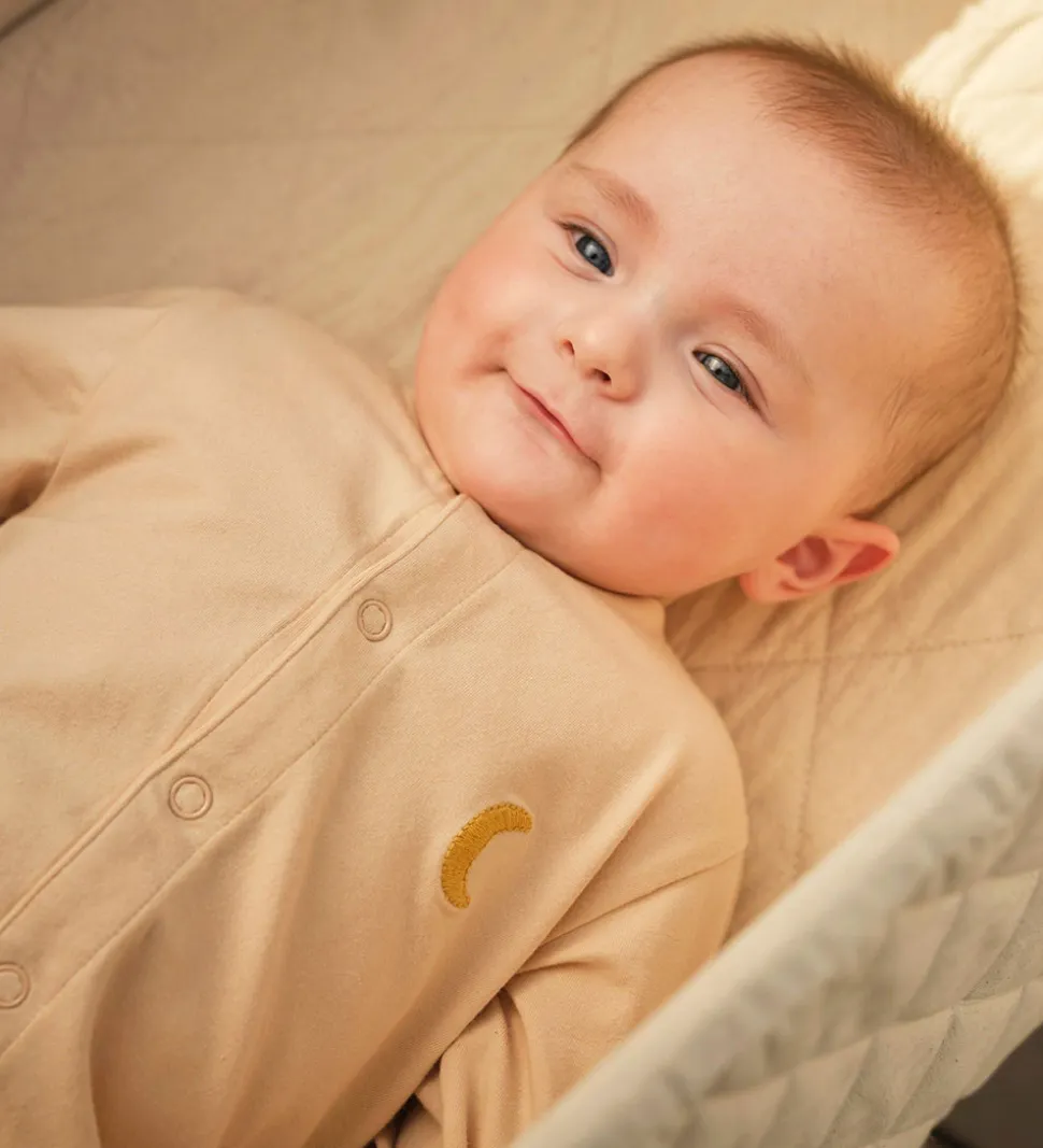 Både natdragten og babyhjelmen har trykknapslukninger og praktiske kanter, og der er smarte ombuk til faste hænder og fødder. Kvaliteten er blødt og strækbart, økologisk bomuld.