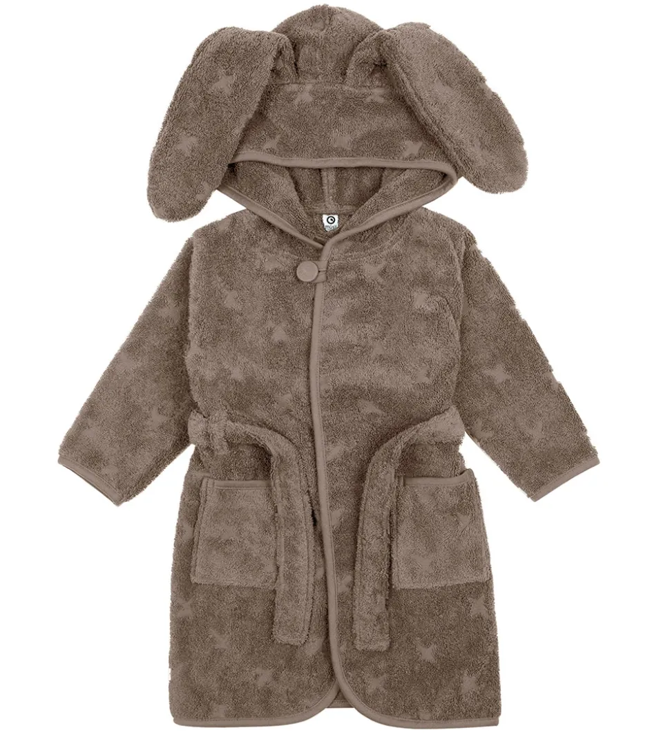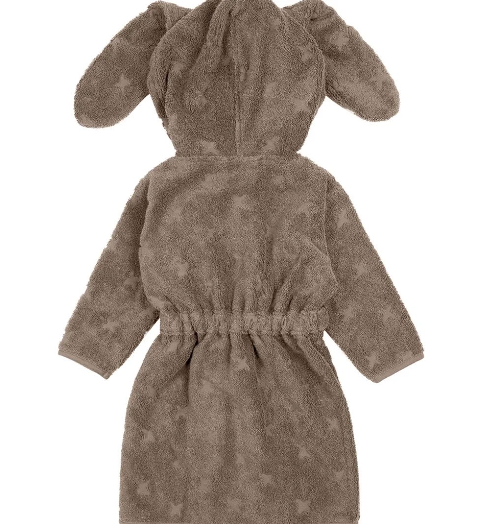 Skøn Müsli badekåbe i støvet brun med et mønster af indprægede stjerner og med søde kaninører på hætten.