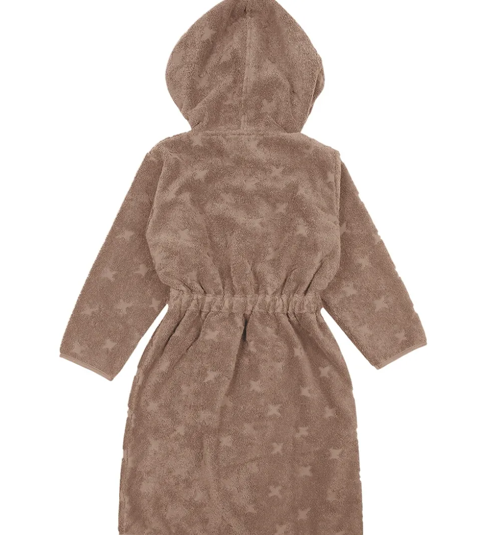 Flot Müsli badekåbe i en varm, lysebrun nuance med et subtilt mønster af stjerner. Den har en blød frottéstruktur, som giver en behagelig følelse.