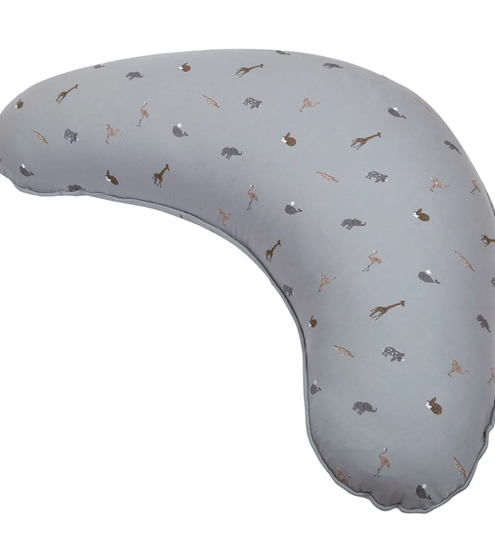 Praktisk Müsli ammepude i grå med blå skær og med et sødt dyreprint i grå og brune nuancer.