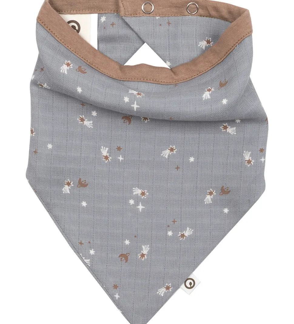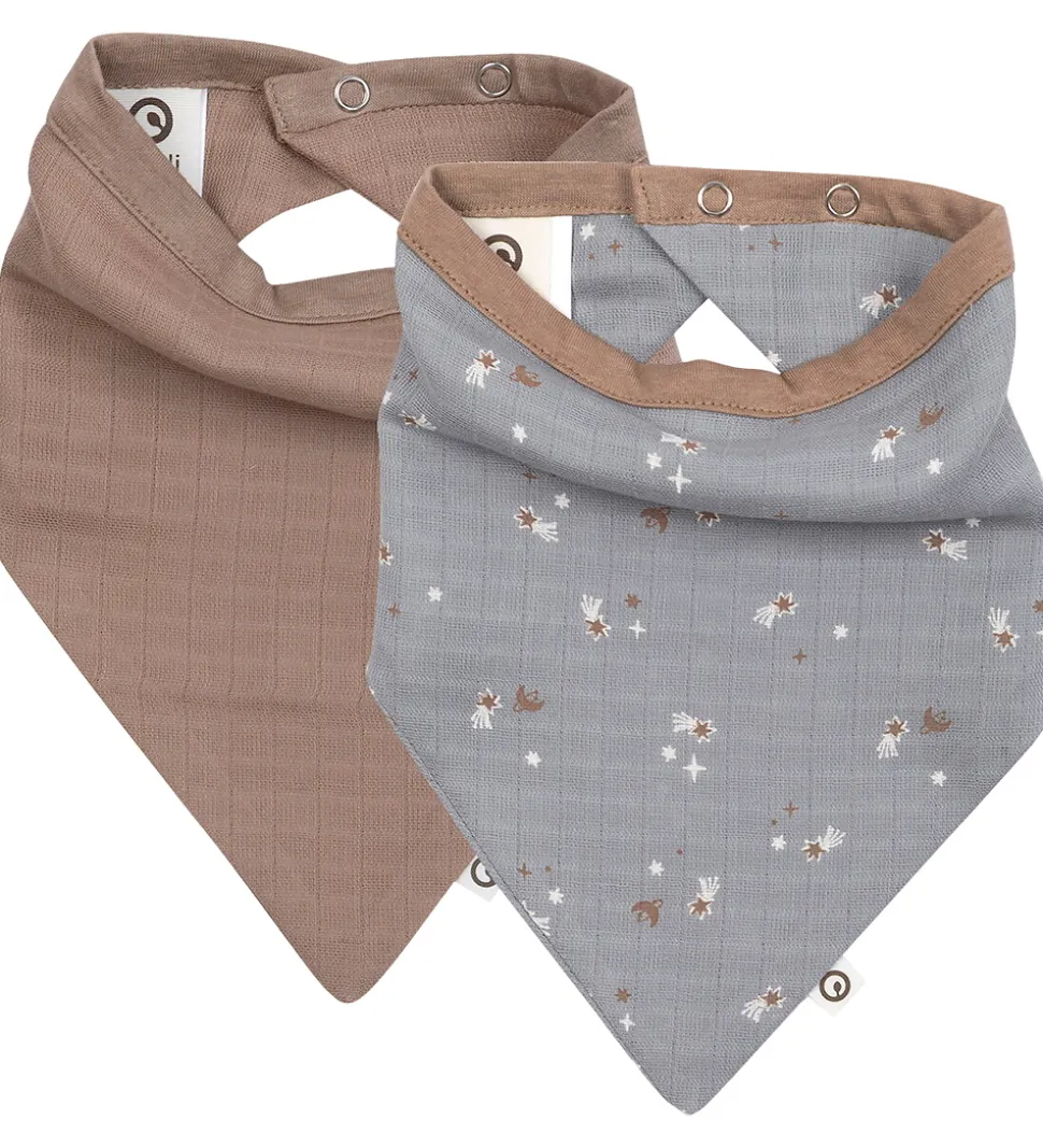 Indbydende Müsli savlesmække med musselinstruktur i en pakke med to. Den ene har en ensfarvet brun nuance, mens den anden er blå med et fint mønster af stjerner og små figurer.