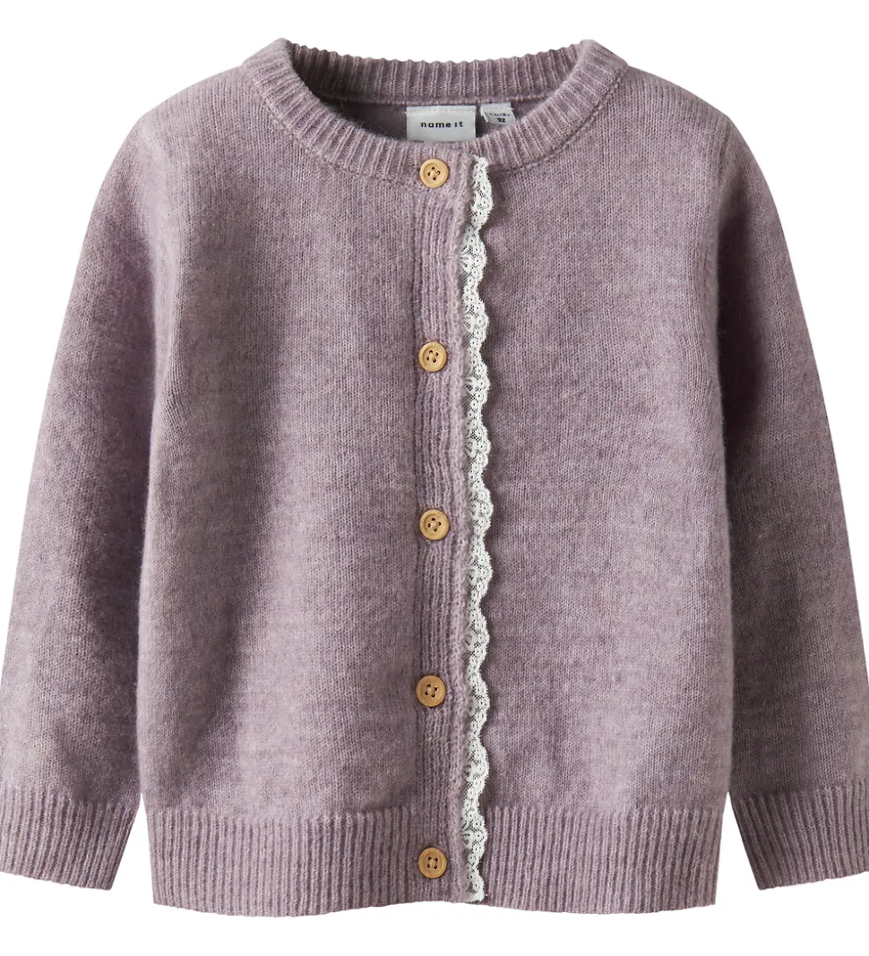Charmerende Name It cardigan i lys lilla med en hvid blondekant langs åbningen fortil. Cardiganen har strikket struktur med gennemgående, brune knapper fortil og lange ærmer.