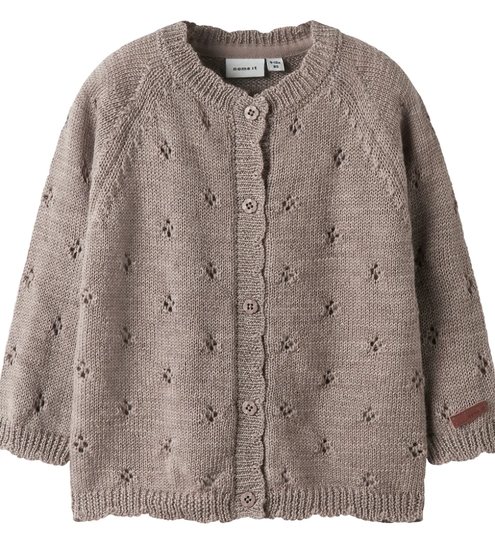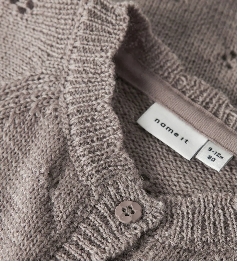 Cardiganen har en flot strikstruktur med små hulmønstre fordelt elegant over hele stoffet. Name It cardiganen har en rund hals og lukkes med en fin række knapper. Ribkanter ved ærmerne og bund giver en god pasform og tilføjer et flot finish til designet.