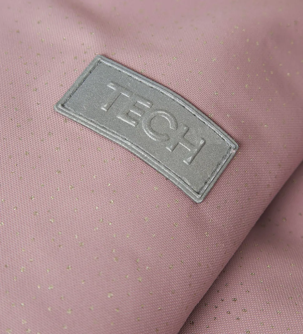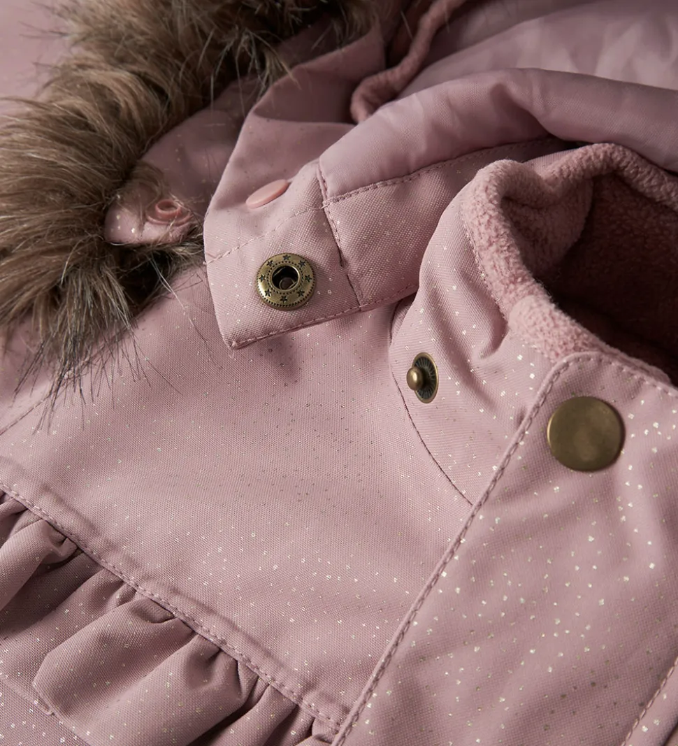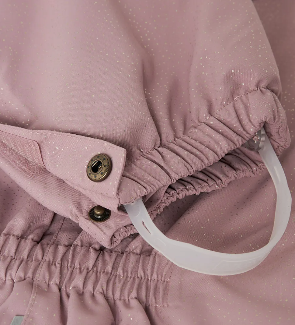 Name It flyverdragten har en aftagelig hætte, som sidder fast med skjulte trykknapper, og den har en flot kant af imiteret pels, som sidder fast med trykknapper. Hættens ansigsåbning har også en indvendig elastikkant af fleece. Ærmerne og benene har elastikkanter, og der er aftagelige, justerbare gummistropper til at sætte under støvlerne. Benåbningerne kan løsnes lidt ved hjælp af velcro og en trykknap.