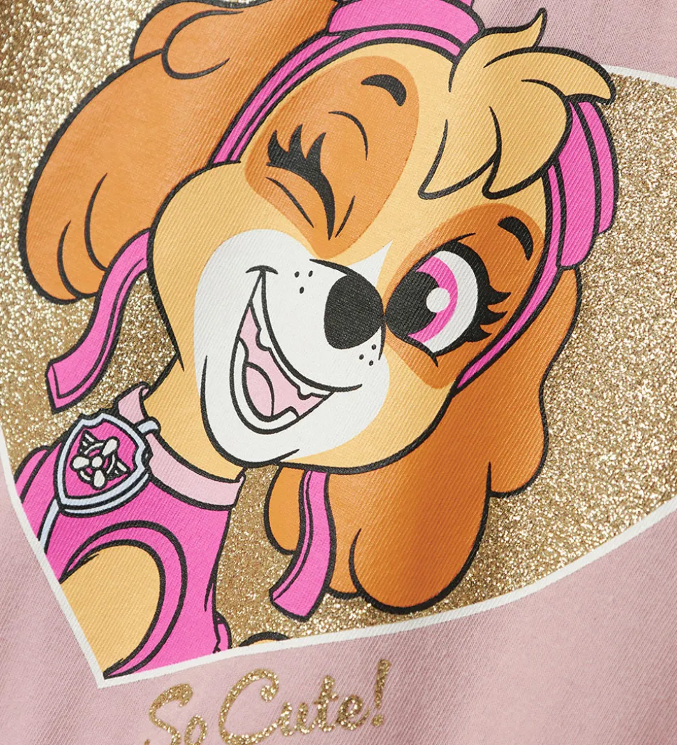 Fin Name It gymnastikdragt i rosa med et stort print på fronten af et hjerte i guld glimmer med en Paw Patrol figur indeni og en sød kanin.