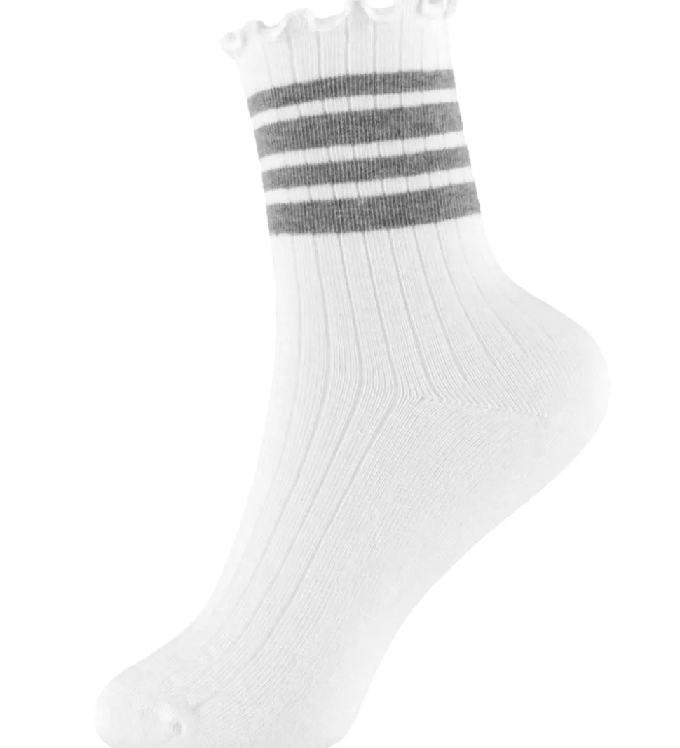 Stilfulde Name It strømper i hvid med gråmelerede, vandrette linjer øverst. Strømperne har en ribbet struktur og en bølget elastikkant ved toppen, der sikrer en god pasform. Name It strømperne kombinerer funktionalitet med et enkelt design.