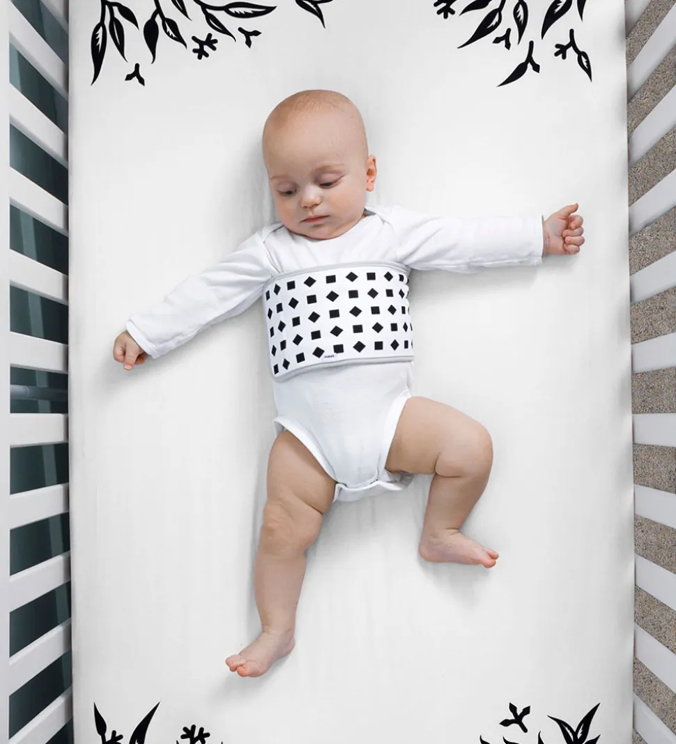 Smart Nanit lagen i hvid med et sort mønster i hjørnerne, der er lavet til Nanits Pro kamera, som ved hjælp af mønstret kan overvåge barnets vækst.