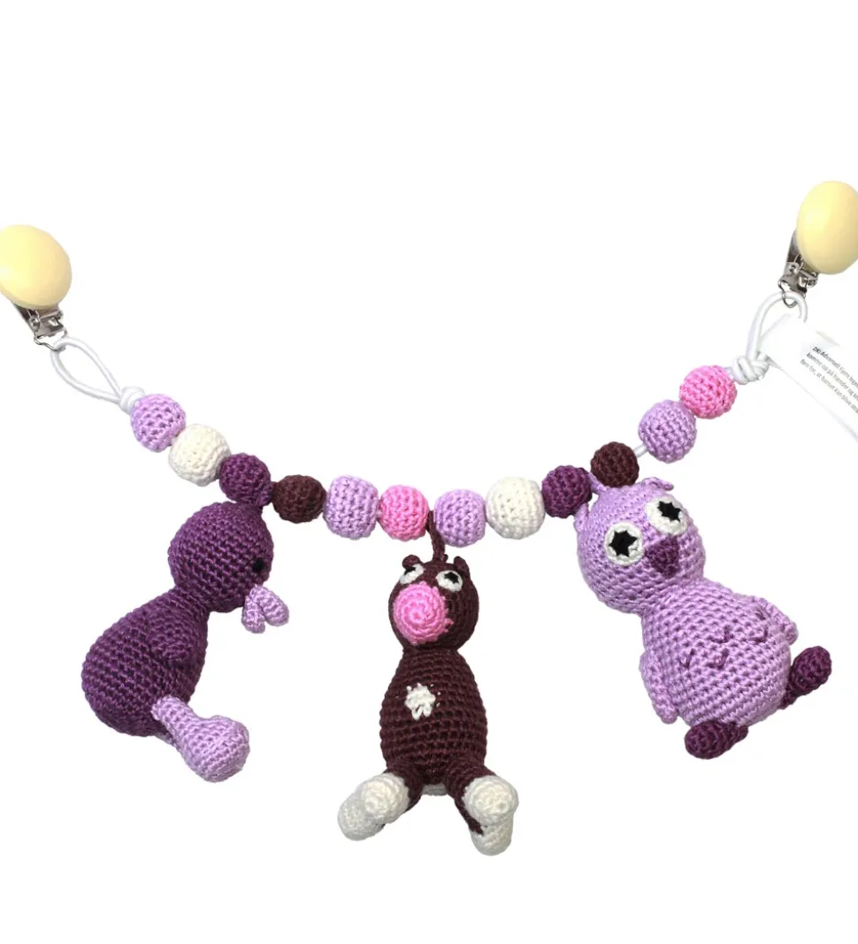 Sød NatureZoo barnevognskæde med en lilla and med lavendel ben, en brun ko med pink mule og en lavendel ugle med lilla detaljer.