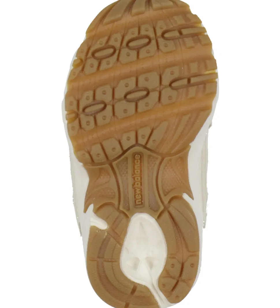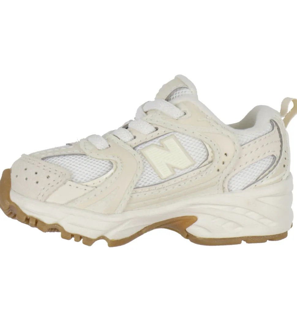 Skønne New Balance sko i beige skind og hvidt mesh. På siderne er det klassiske logo i beige.