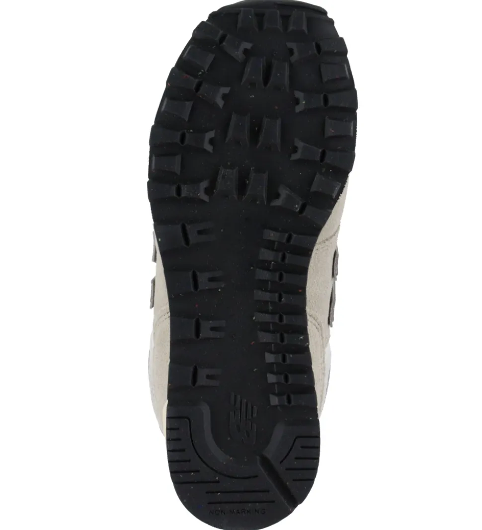Stilfulde New Balance sko i gråbeige ruskind med logo på siderne i sølv og bordeaux. På hælene er der en detalje i bordeaux.