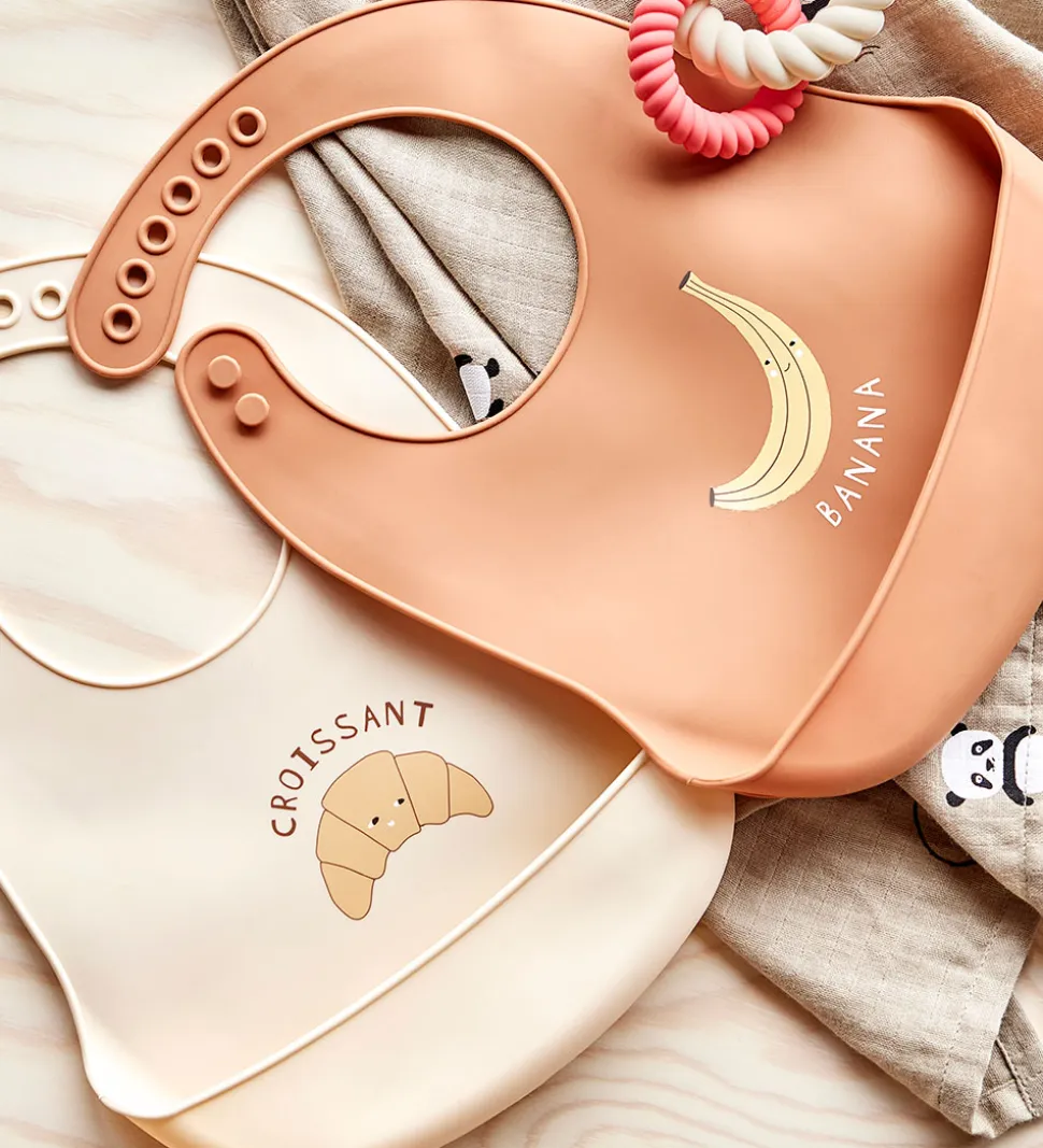 OYOY hagesmækkene har hver en praktisk lomme i bunden, som opsamler krummer og andre madrester. Hagesmækkenne knappes i nakken med et smart knap-system med flere indstillinger. Hagesmækken er lavet i fleksibelt silikone.