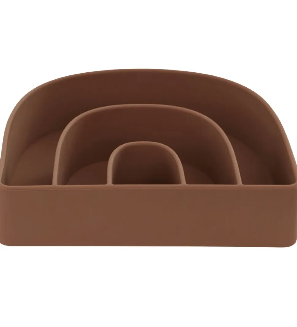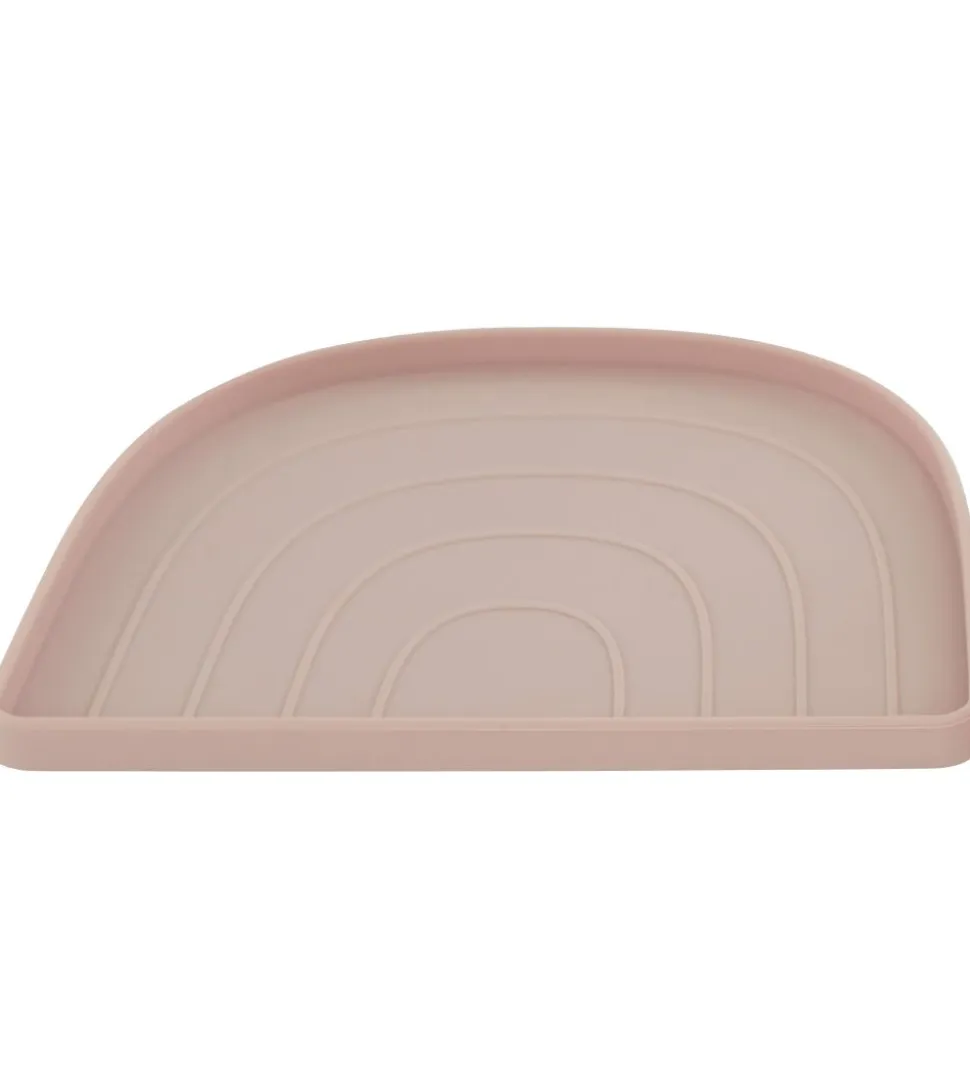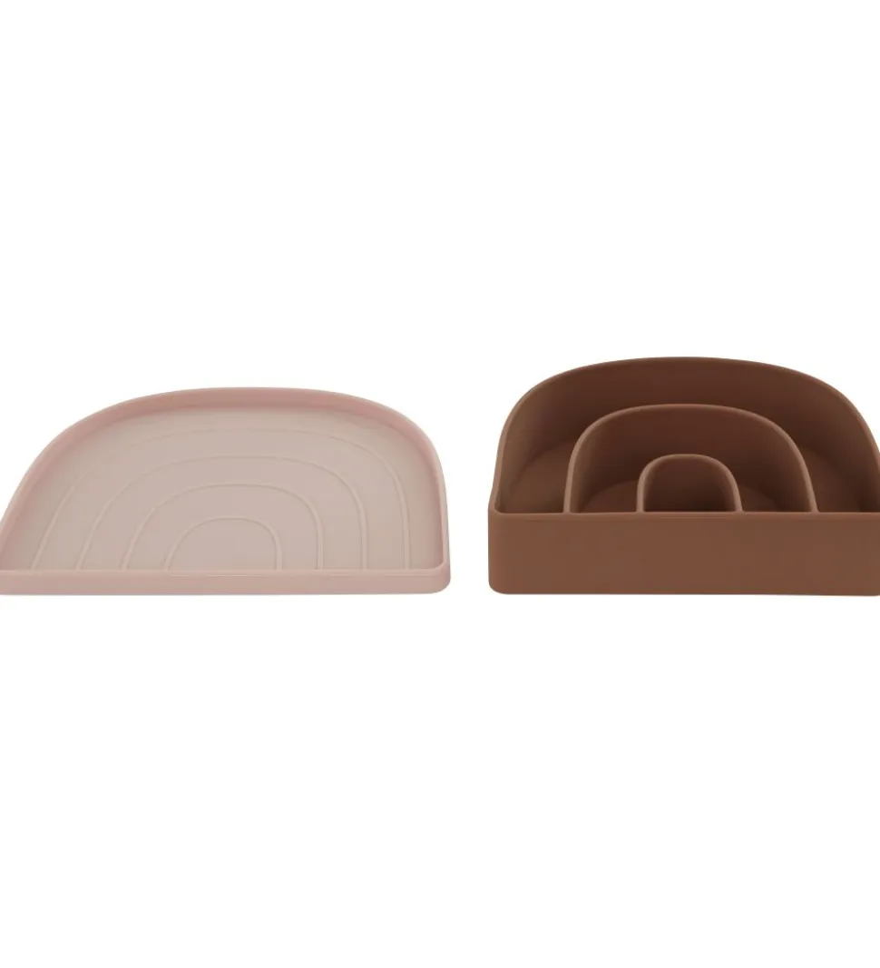 Praktisk OYOY tallerken og skål, begge med form som regnbuer i rosa og brun.