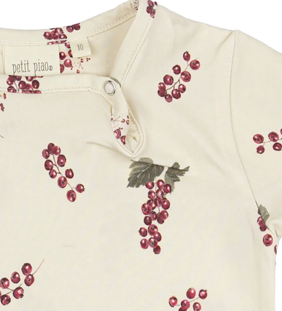 Skøn sommerdragt fra Petit Piao i en lys beige med et fint bærprint i røde og grønne nuancer. Sommerdragten har korte ærmer og knaplukning ved skulderen samt mellem benene til nem påklædning.