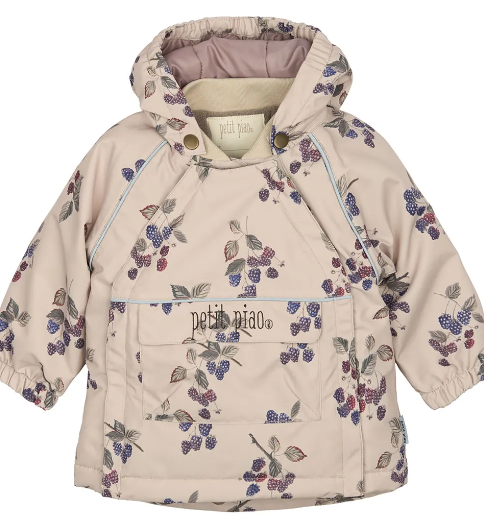 Skøn Petit Piao vinterjakke i beige med et alloverprint af brombær. Vinterjakken er med praktiske reflekspipings og et broderet logo fortil.
