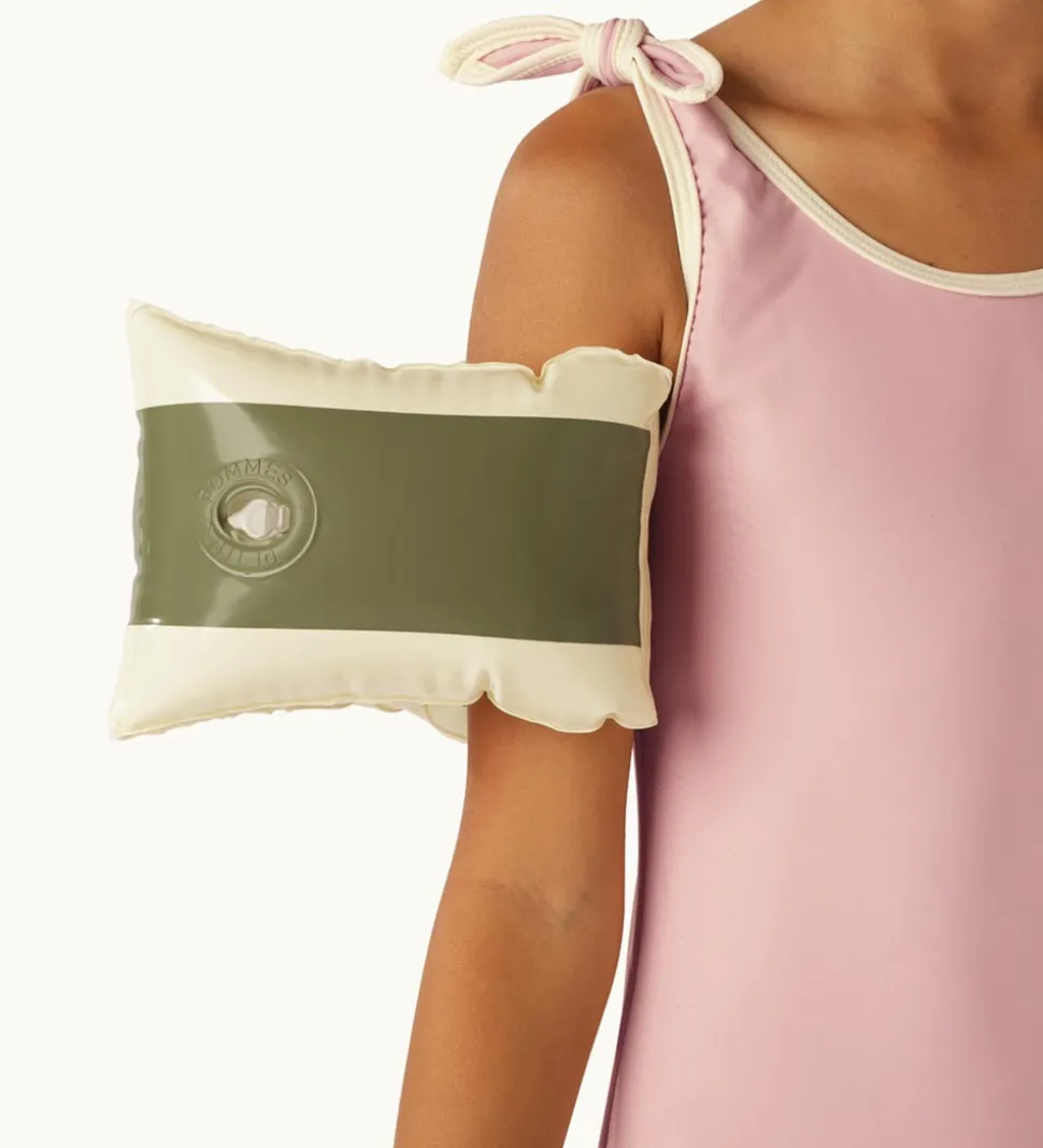 Flotte Petites Pommes badevinger i cremhvid med en bred, støvet grøn stribe.