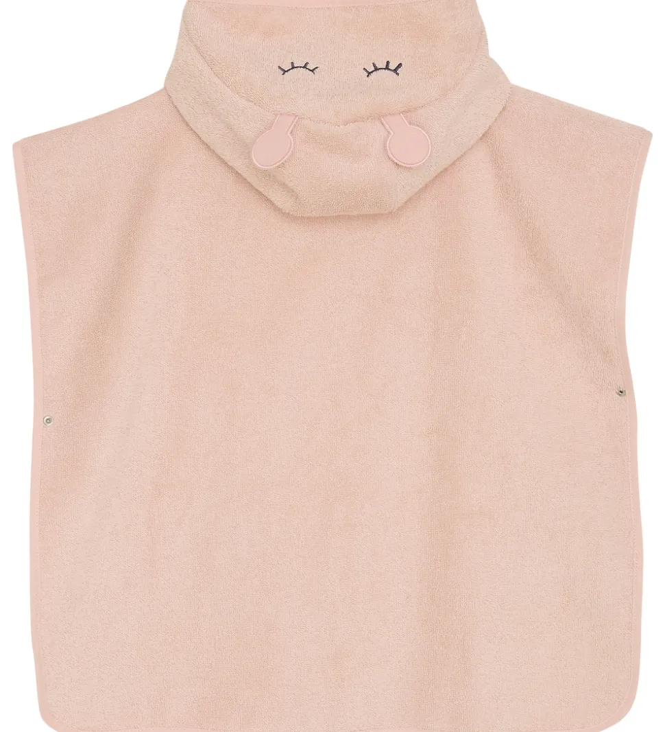 Sød Pippi baby badeponcho i rosa med broderet øjne og fine ører på hætten.