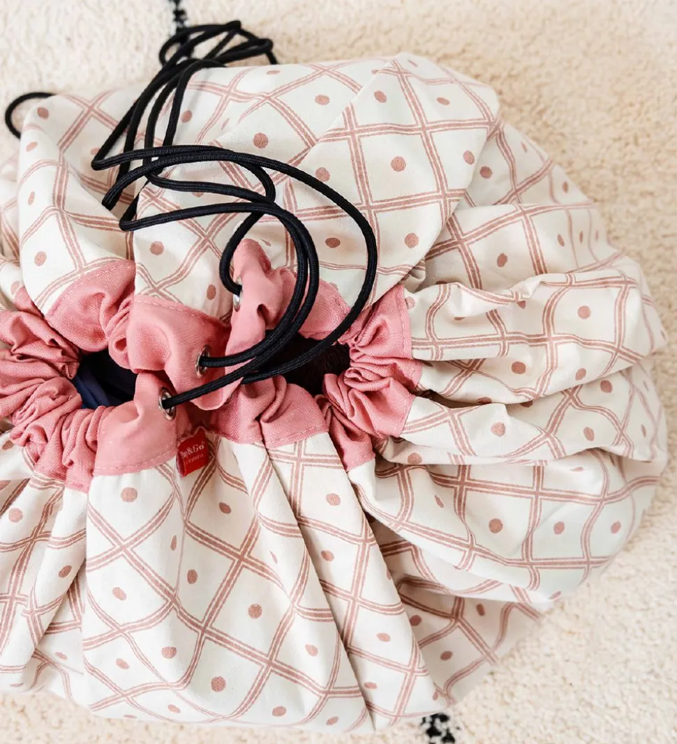 Smart Play&Go legetøjstæppe i cremefarvet kanvas med et flot rosa mønsterprint på ydersiden.