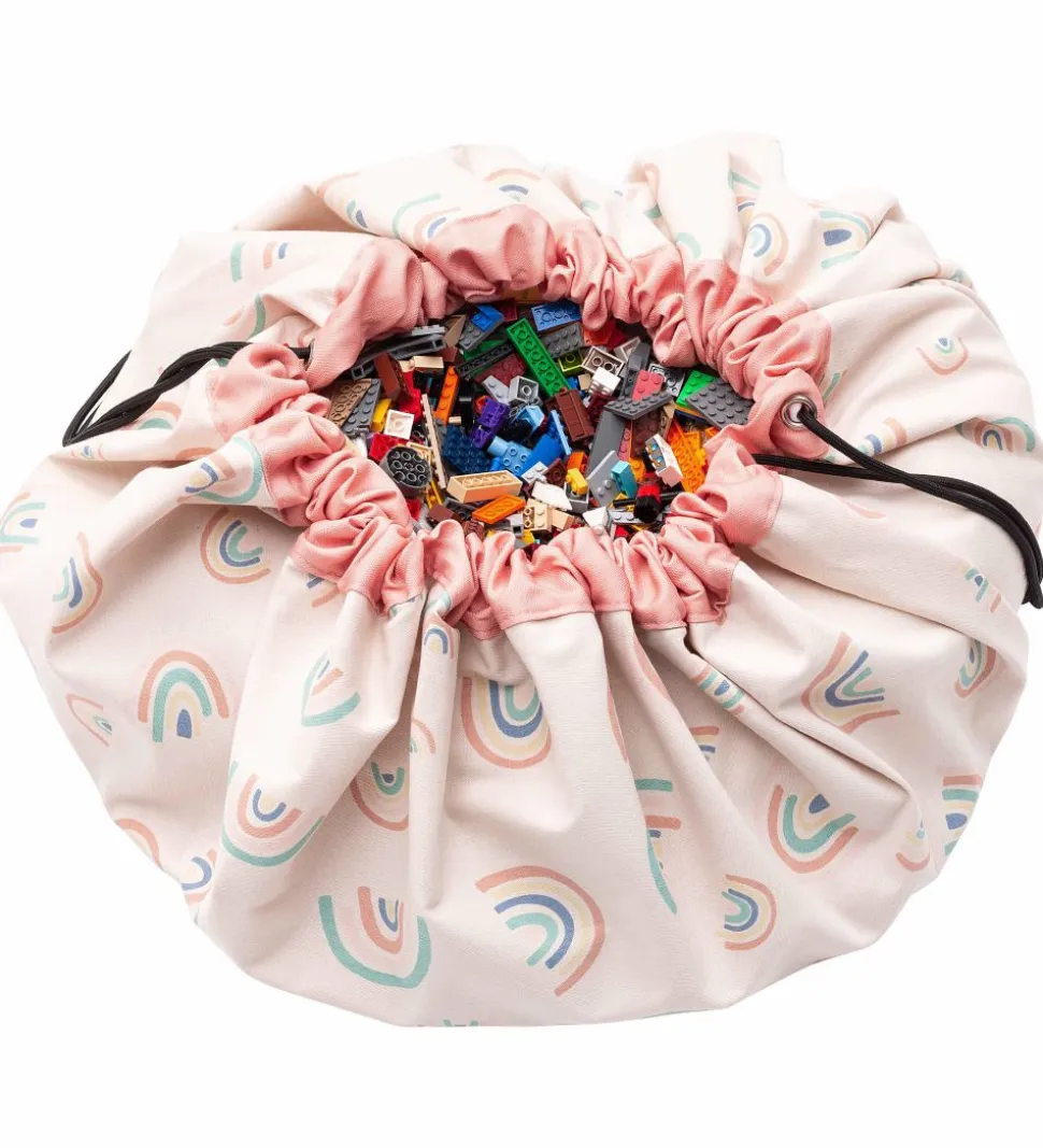 Play&Go legetøjstæppet er et stort cirkelformet stykke stof med en løbegang hele vejen rundt med en sort snor, så man kan snøre tæppet sammen til en pose. I posen kan man opbevare sit legetøj, og når børnene synes, at legetøjet skal med ind i stuen, kan posen åbnes og legetæppet folder sig ud. Bagefter er det hurtigt og nemt at rydde op og lægge på plads.