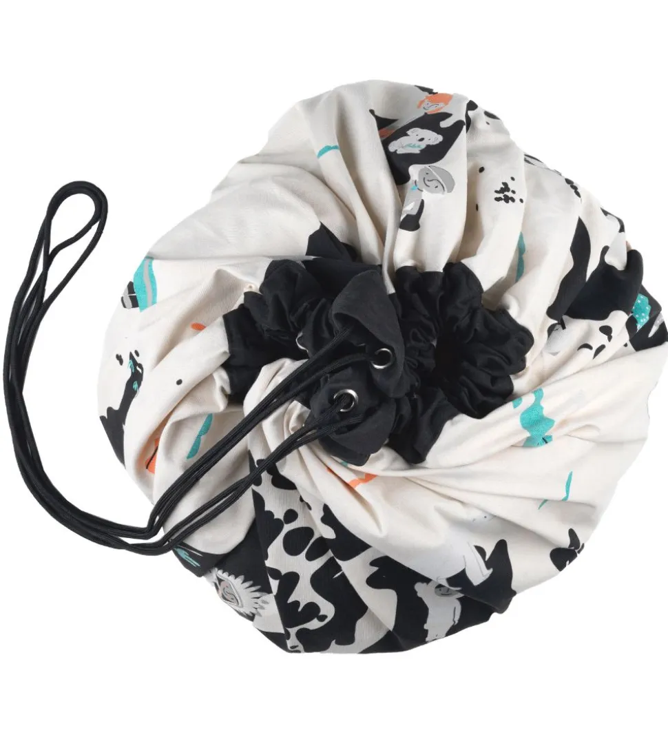 Play&Go legetøjsposen er et stort cirkelformet stykke stof med en løbegang hele vejen rundt med en sort snor, der kan snøre posen sammen. Posen er praktisk til fx opbevaring af legetøj og er fremstillet af fastvævet kanvas, der kan tåle at blive brugt.