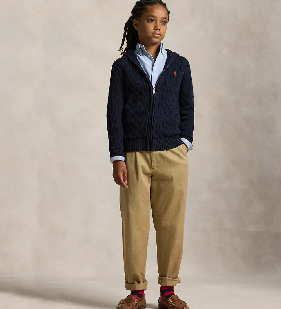 Charmerende Polo Ralph Lauren cardigan i en dyb navy farve med kablet strikmønster. Cardiganen har en praktisk lynlås foran og er udstyret med en hætte. Polo Ralph Lauren logoet ses broderet på brystet i en kontrasterende rød farve. To frontlommer er tilgængelige, og ribkanter giver en passende pasform.