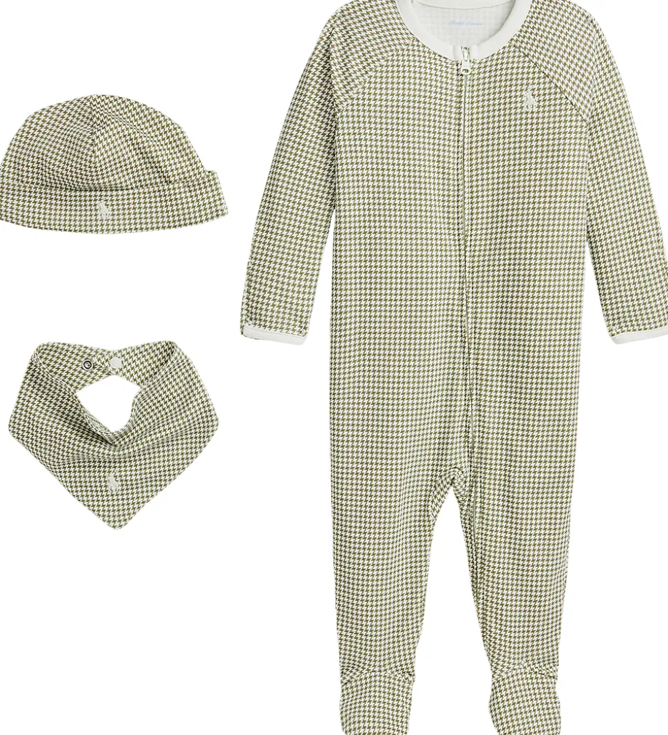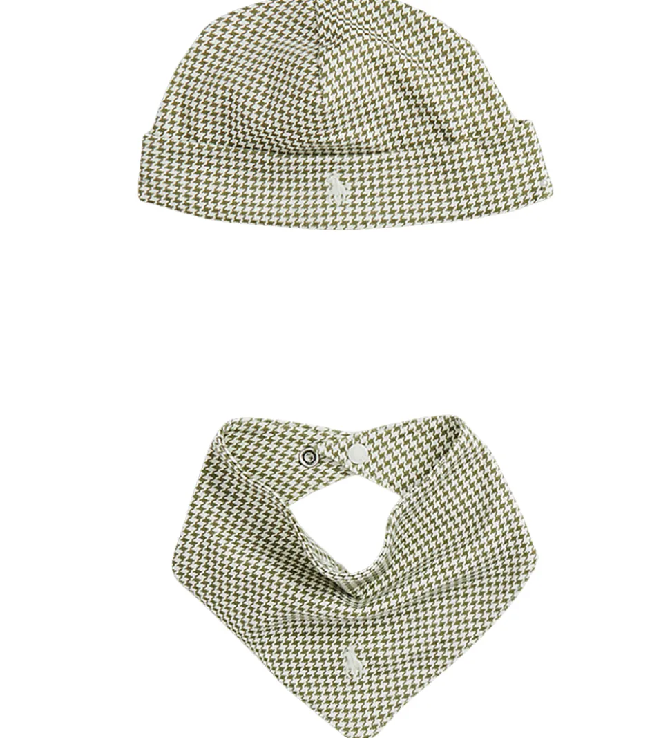 Flot Polo Ralph Lauren gavesæt, der består af en heldragt, en hue og en savlesmæk med et ternet mønster i hvid og grå.
