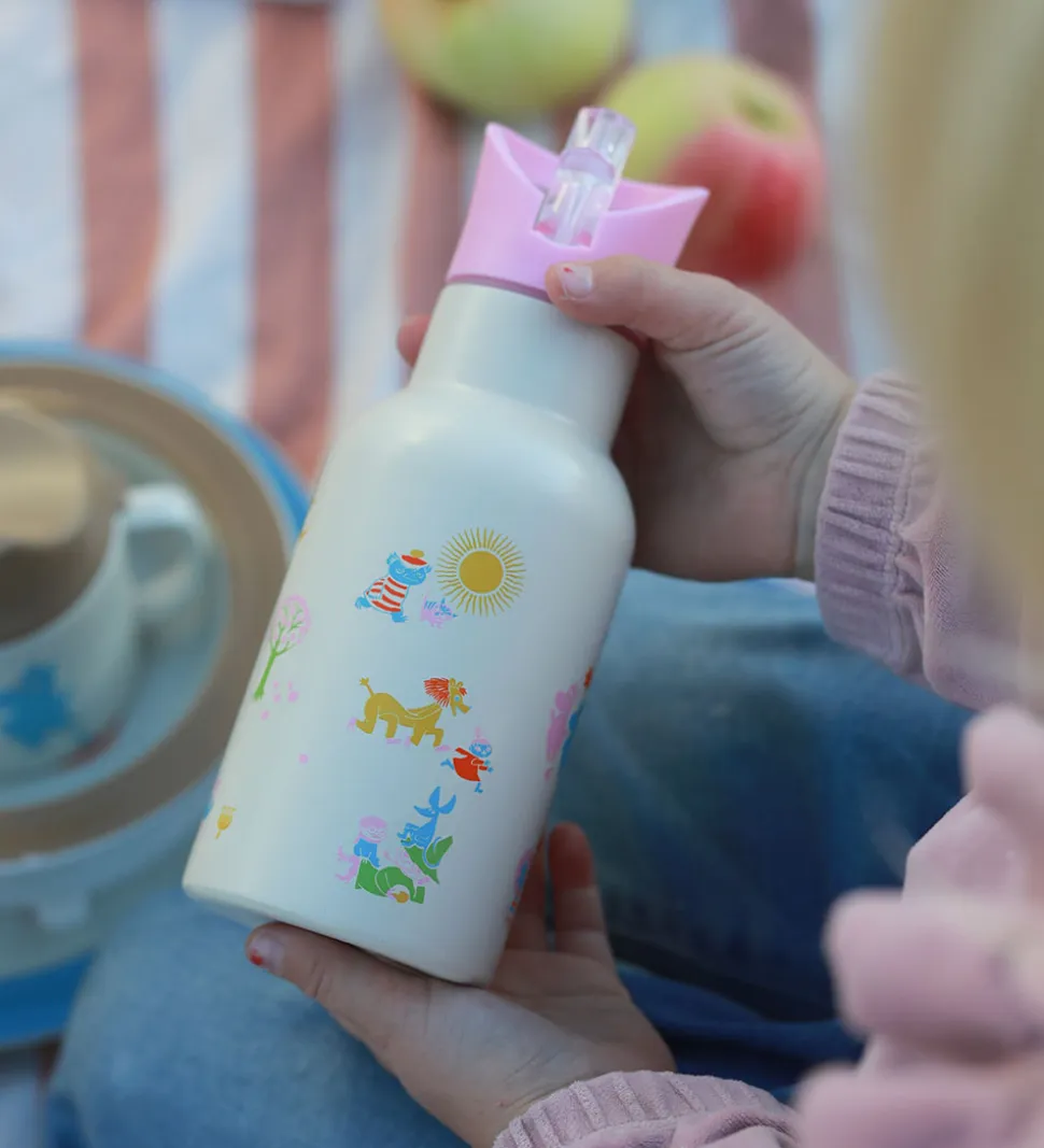 Skøn Rätt Start termoflaske i beige med et farverigt Mumi-print og et rosa låg. Termoflasken er en del af en jubilæumsserie for Mumitroldenes 80-årsfødselsdag.