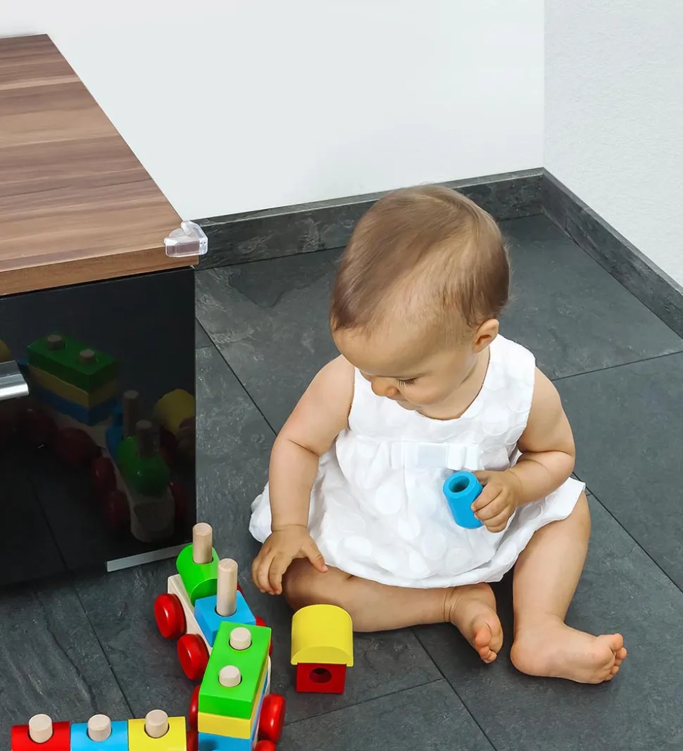 Reer hjørne- og kantbeskytterne er lavet af plast. De beskytter dit barn mod skarpe hjørner på f.eks. borde, reoler og hylder. De er hurtig og enkel at montere med det medfølgende selvklæbende tape. Hjørnebeskytterne har et moderne og diskret design.