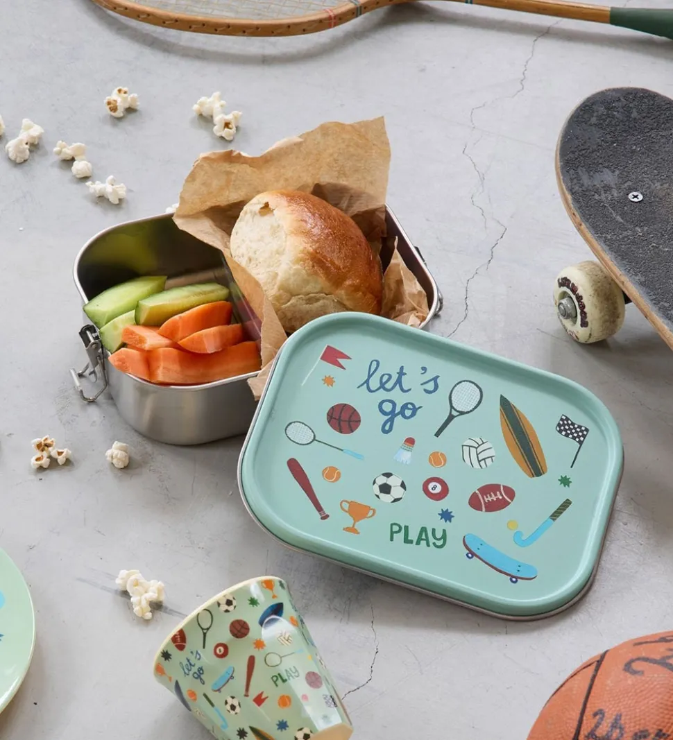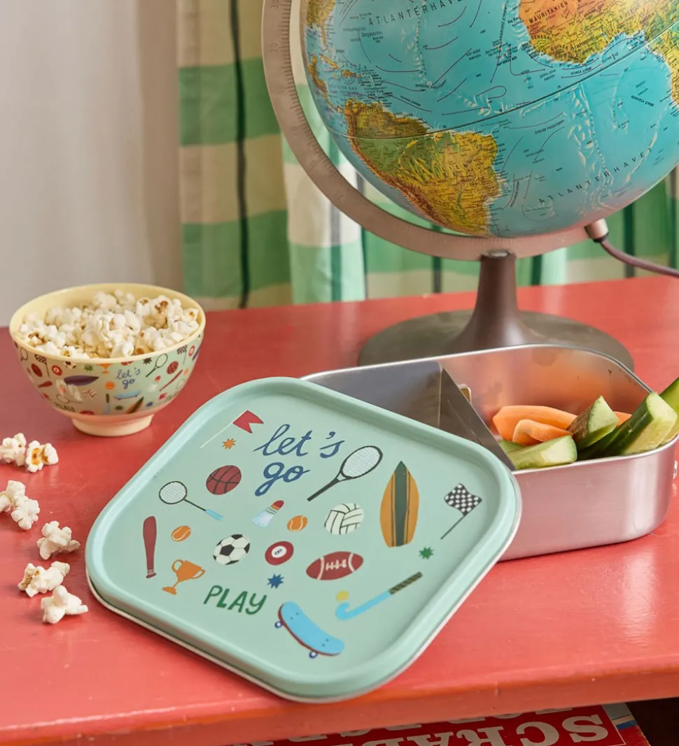 Flot Rice madkasse i rustfrit stål, og på låget er den støvet grøn med et print med forskellige seje sportsmotiver.
