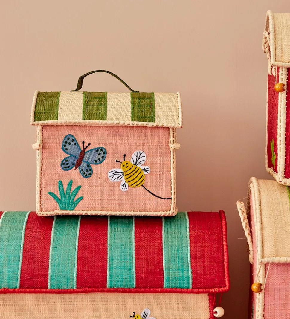 Sød Rice opbevaringskurv lavet som et hus og udsmykket i et rosa sommerfugletema med grønne striber på taget.