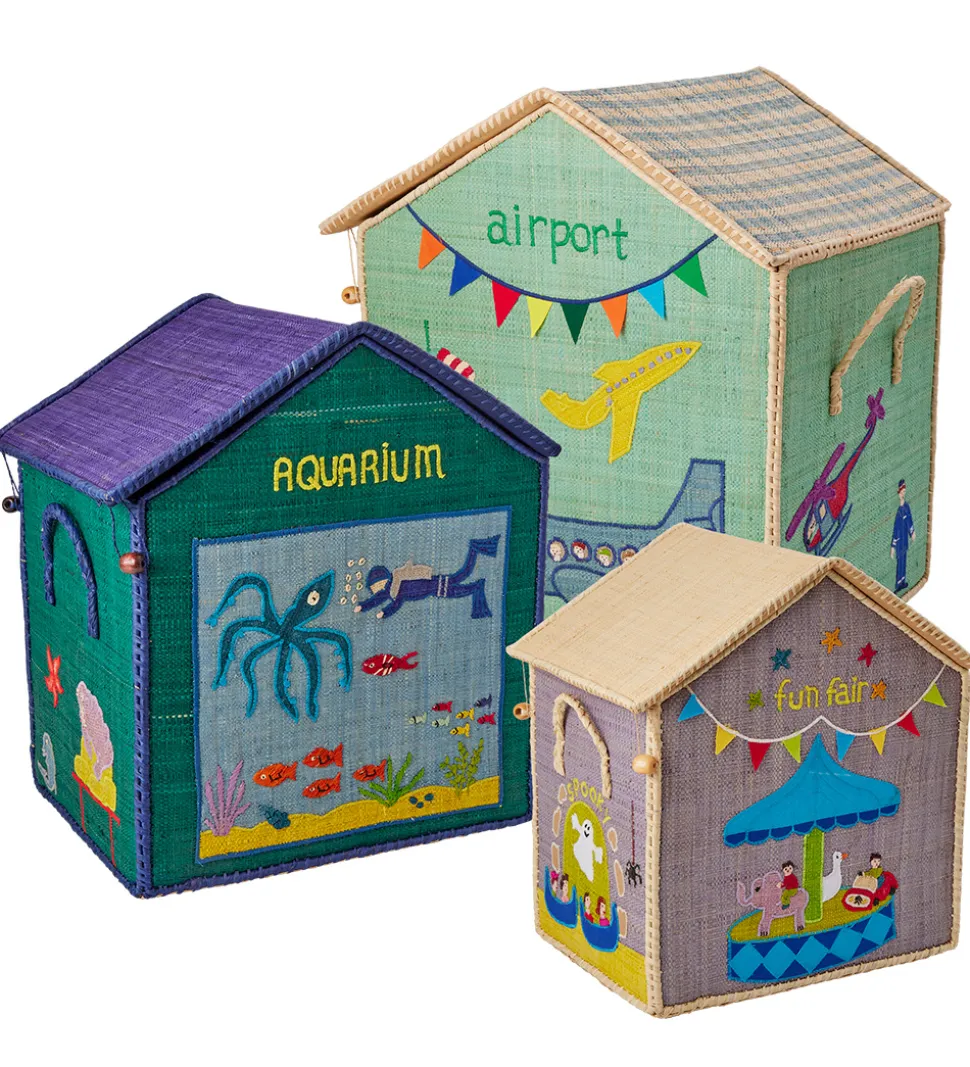 Søde Rice opbevaringskurve lavet som 3 huse, der alle er udsmykket i et “vacation”-tema med flotte farver.