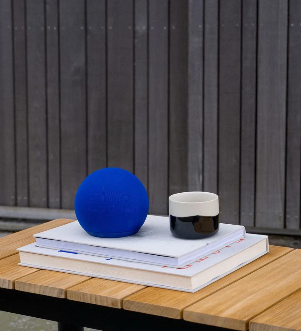 Elegant SACKit højtaler i en intens blå farve. SACKit højtaleren har en rund form med praktisk snor, der gør den nem at bære. Stilfuldt design, der passer ind i enhver indretning.