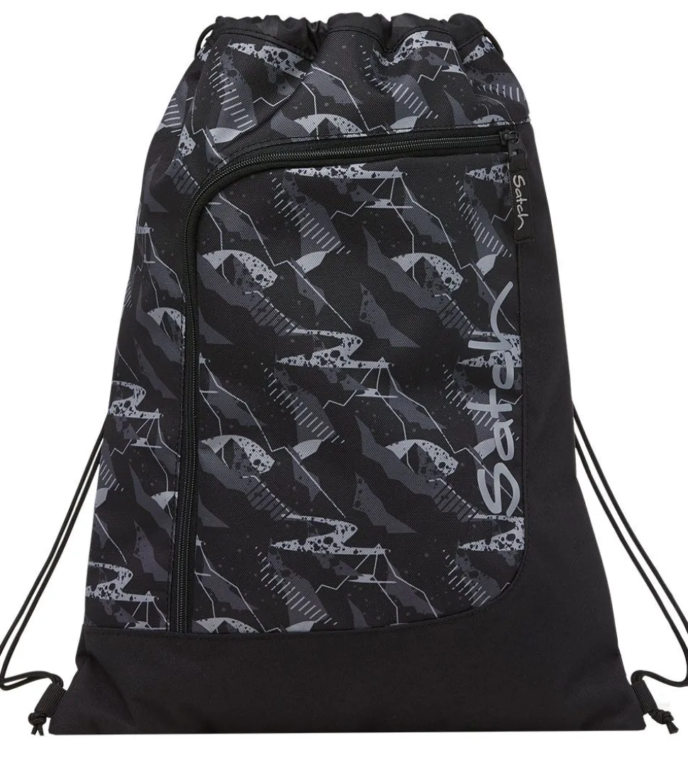 Skøn Satch gymnastikpose i sort med et print af abstrakte former i grå, og ned ad den ene side står der “Satch” med store, grå bogstaver.