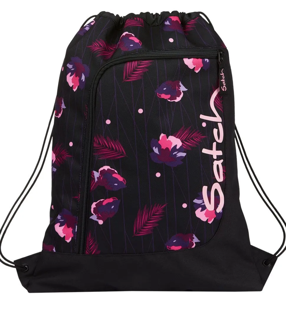 Fin Satch gymnastikpose i sort med et blomsterprint i rosa og lilla nuancer, og ned ad den ene side står der “Satch” med store, rosa bogstaver.