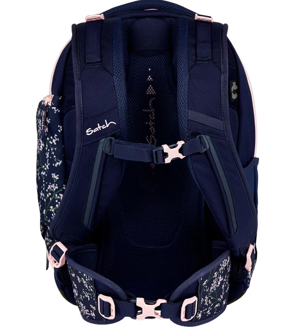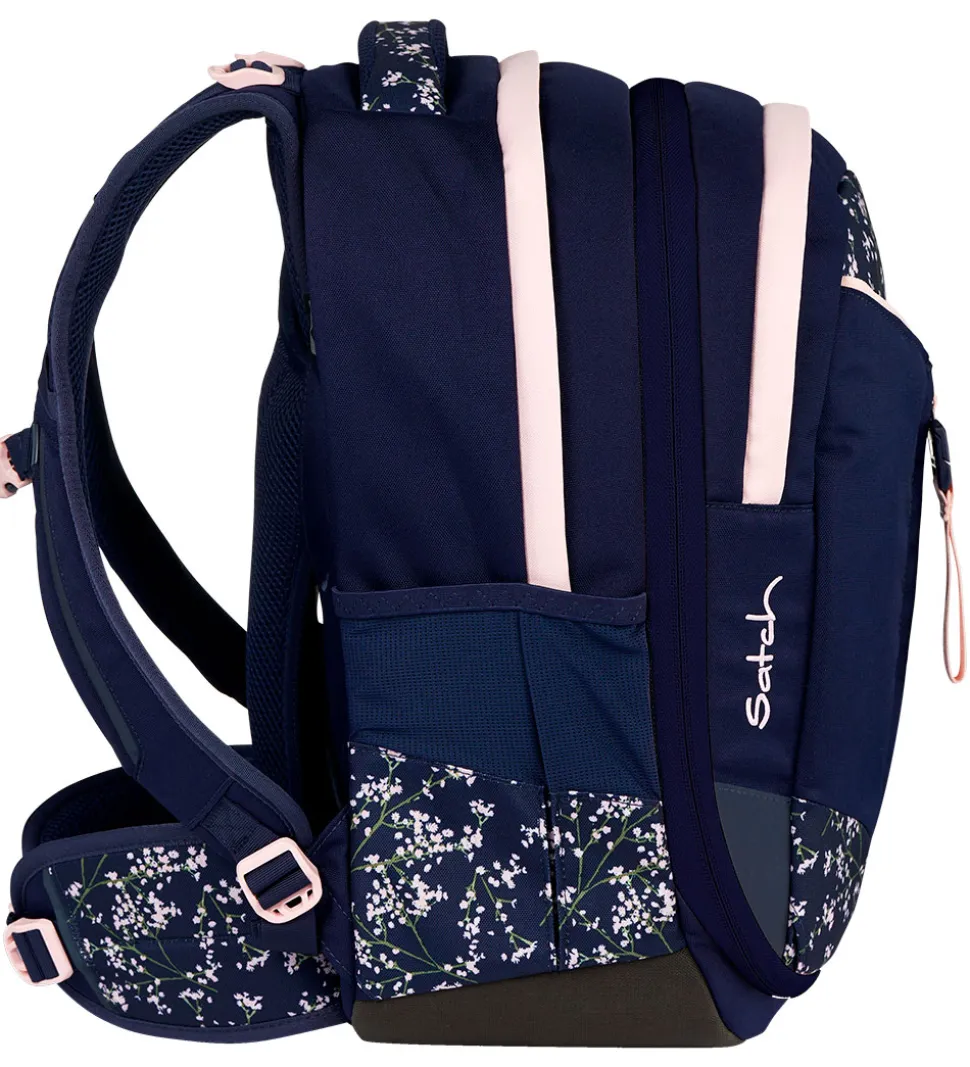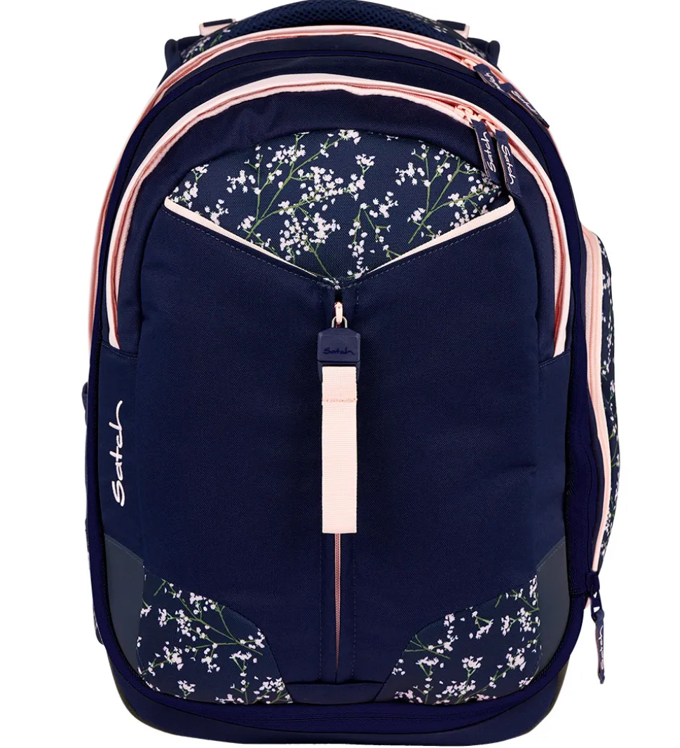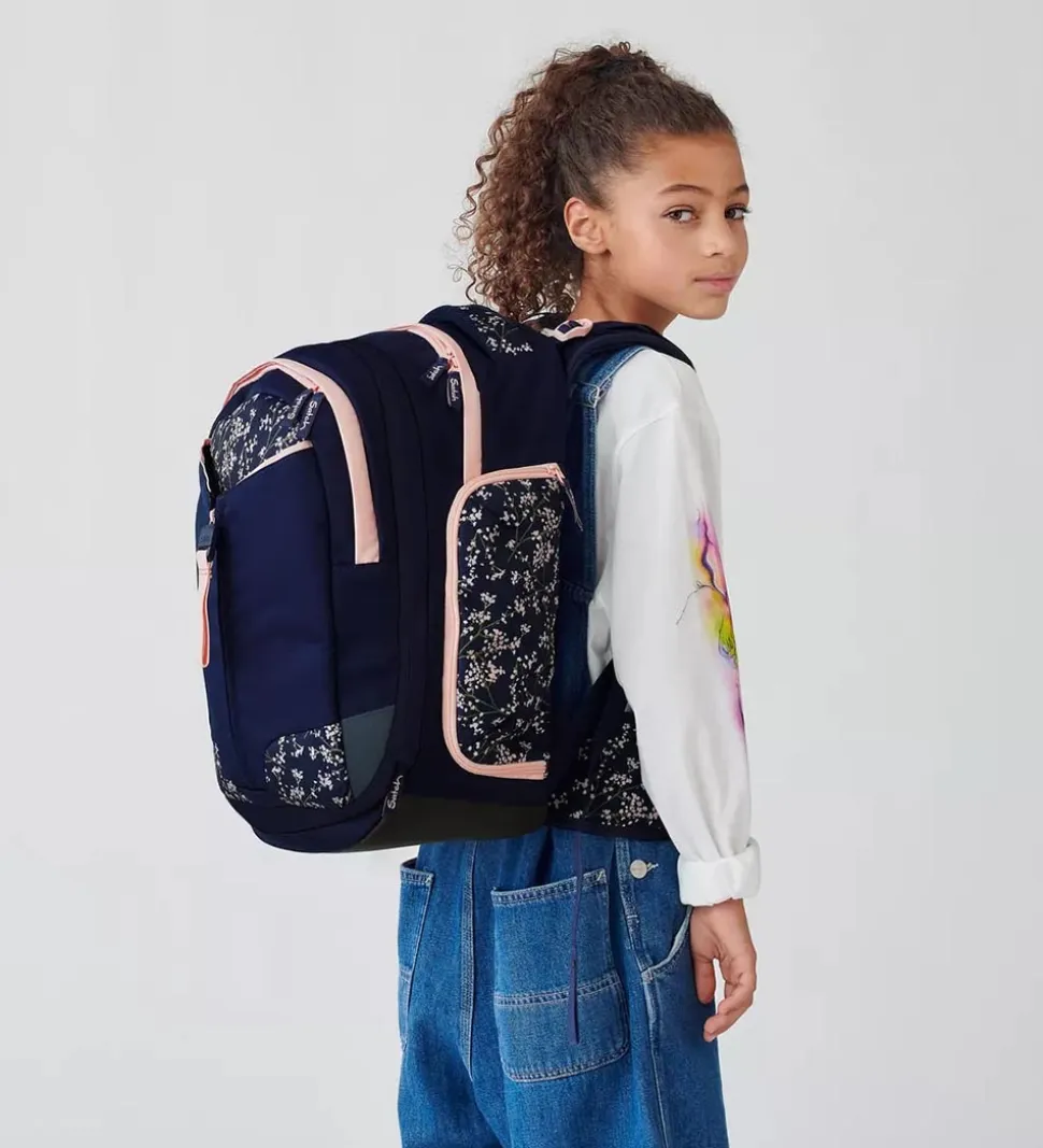 Flot Satch skoletaske i navyblå med et rosa blomsterprint og detaljer.