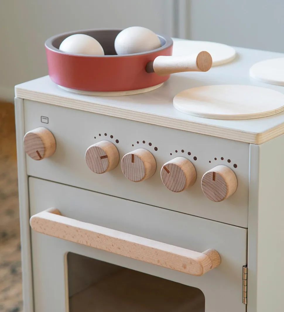 Fint Sebra legekøkken i form af et komfur med ovn af træ malet i en beige nuance.