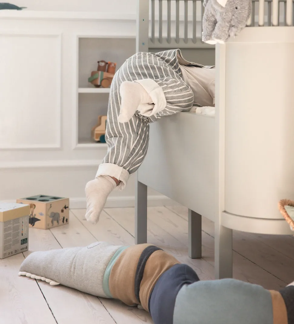 Lækker Sebra pude i blå, brune og grå nuancer og formet som en meget lang krokodille med sjove, små dinglende fødder og sovende øjne