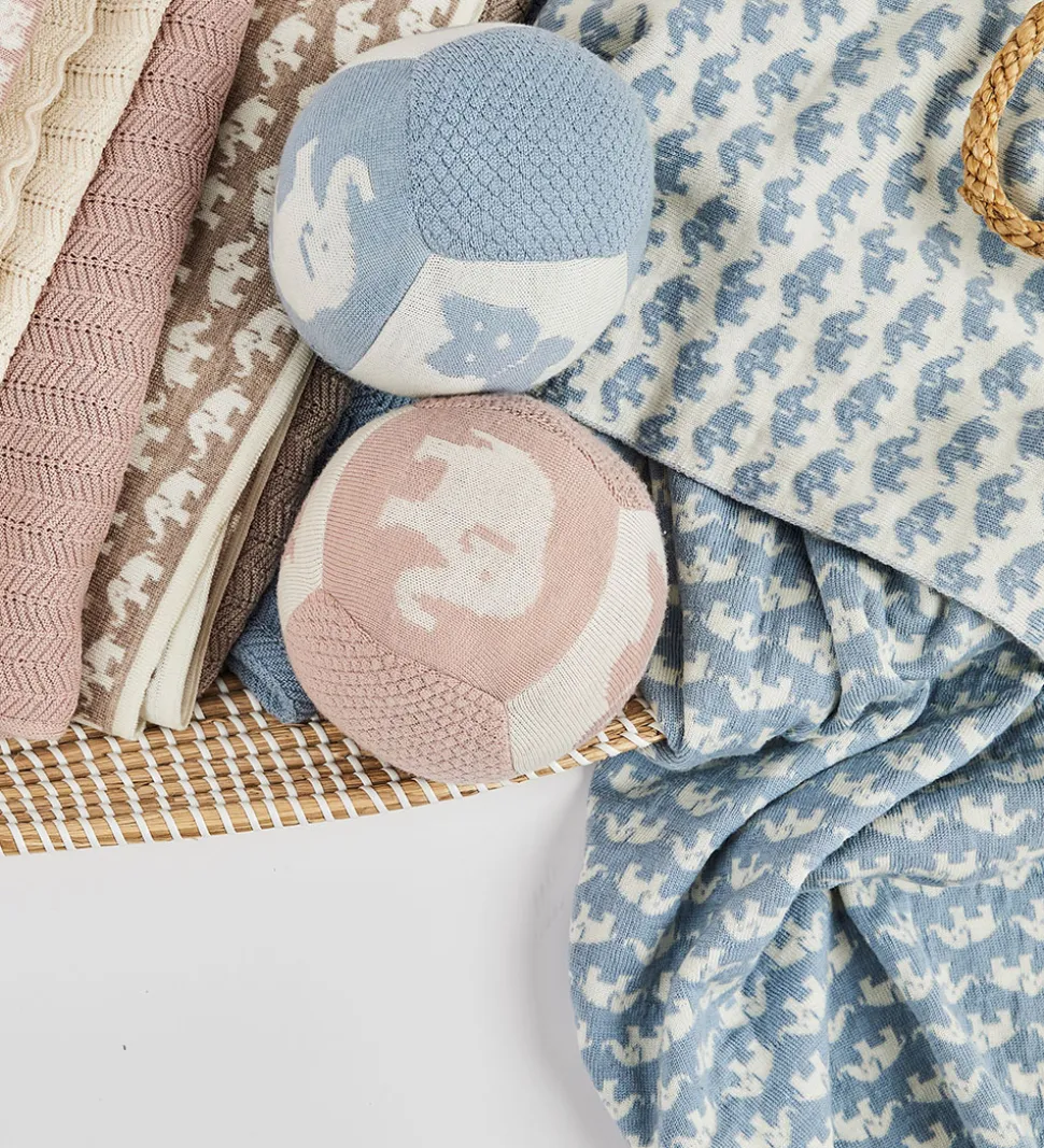 Skøn Smallstuff tæppe i lyseblå strik med fine, hvide elefanter.