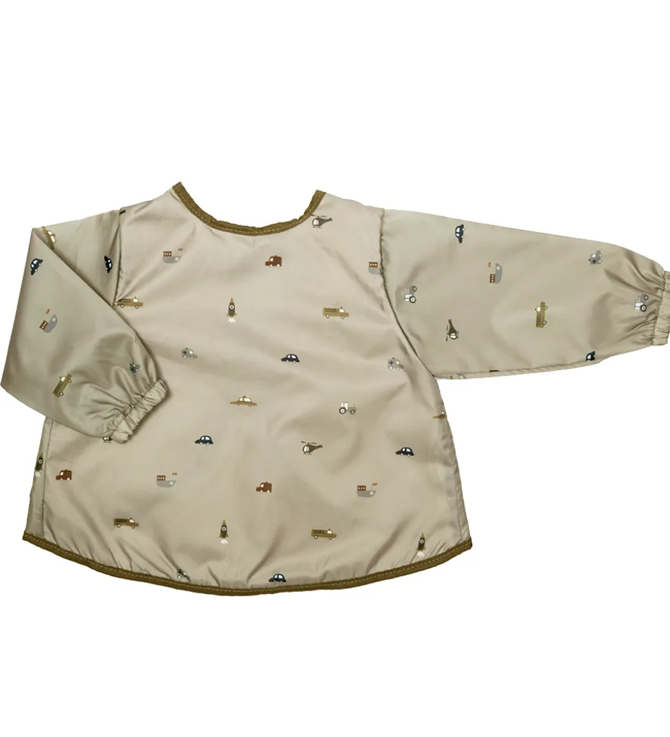 Fint Smallstuff forklæde i en støvet armygrøn nuance med et sødt print af små udrykningsfartøjer.