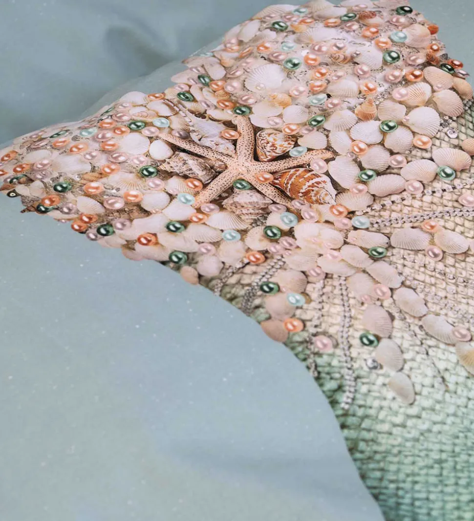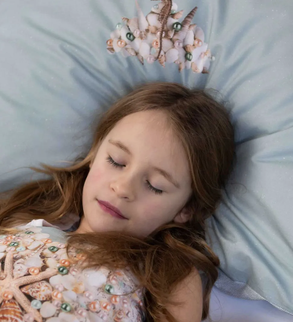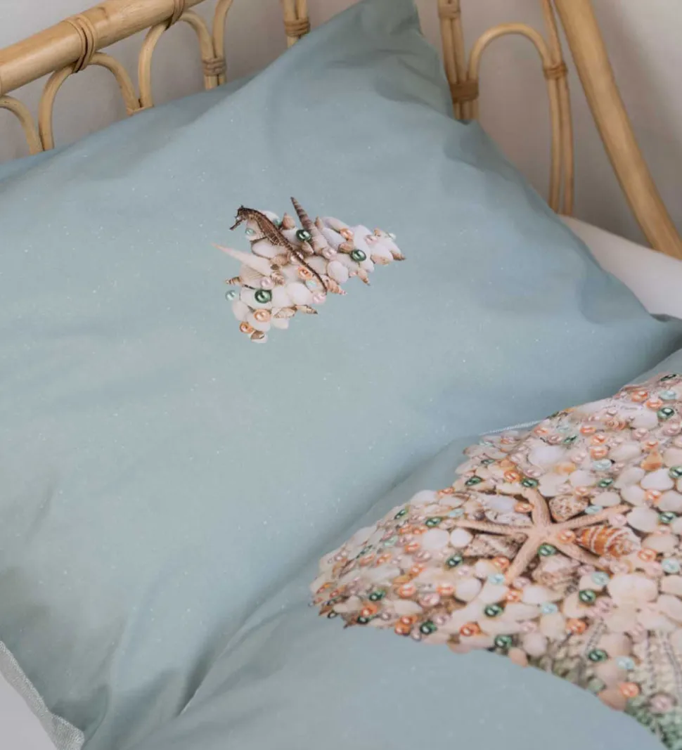 Smukt Snurk sengetøj i lyseblå med et print på dynen af en havfrue og en fin havfruekrone på puden. Snurk sengetøjet består af et hovedpudebetræk med foldelukning, og et dynebetræk som lukkes med en lynlås i bunden. Sengetøjet skaber en smuk og drømmende atmosfære på børneværelset.